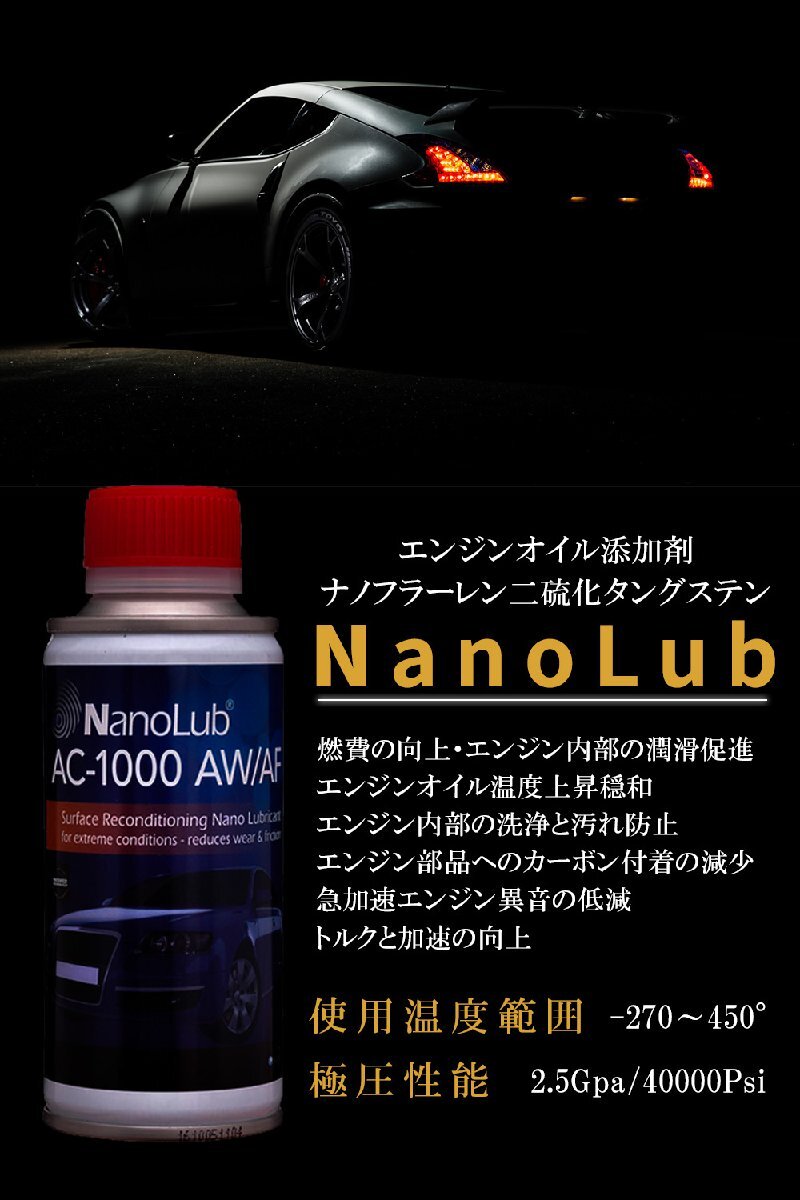 | 商品説明 | 愛車のエンジンをいたわり、蘇えらせる! 史上最強・最高! エンジンオイル添加剤。ついに日本上陸! 世界唯一のナノ単位無期二硫化タングステンエンジンオイル添加剤です。 他の伝統的な市販の個体潤滑剤よりも遥かに潤滑性が高く中空の構造 で耐衝撃性と耐摩耗性が良好です。 ナノルバ AC-1000は無期フラーレン構造で(サイズは20nm~200nm) 従来の技術と比較して最高水準の極圧性、耐熱性、耐寒性を備え、 摩擦係数に優れたオイル添加剤です。 エンジンオイル添加剤とは IF-WS2エンジンオイル添加剤はアメリカNIS社がイスラエル国立科学アカデミー会員 Reshef Tenne氏の発明によるNanolubフラーレンIF-WS2の技術を利用した世界唯一のナノ単位の 無機二硫化タングステンエンジンオイル添加剤です。 化学的な添加材料や酸化防止剤を一切使用してないので、エンジンオイルと化学的に反応する事が無い上、 沈殿物などの潤滑を妨げる汚物が一切発生しません。 また、耐熱温度が高い(450℃)ため、高温によって酸化物が発生しないので、エンジン部品に対し腐蝕の心配がありません。 市販の二硫化モリブデン、グラファイト、テフロン(PTFE)、窒化ホウ素などの伝統的な固体潤滑剤 よりも遥かに潤滑性が高く、中空の構造で耐衝撃性と耐摩耗性が良好です。 NanolubIF-WS2は無機フラーレン構造で(サイズは20mm~200mm)従来の技術と比較して 最高水準の極圧性、耐熱性、耐寒性を備え、摩耗係数に優れたオイル添加剤です。 ※必要使用量目安、4Lオイル交換に対して150mlが適当 成分:ナノ二硫化タングステン、ベースオイル 容量:150ml YouTubeで『ナノルバ AC-1000 』で検索して頂ければ 下記の3タイトル(日本語字幕付き)をご視聴頂けます。 1.Nanolub・ナノルバ株式会社 AC-1000 の全て 2.Nanolub・ナノルバ株式会社 AC-1000-TIMKEN摩擦試験 3.Nanolub・ナノルバ株式会社 AC-1000 ディーゼルエンジン添加剤編 |
