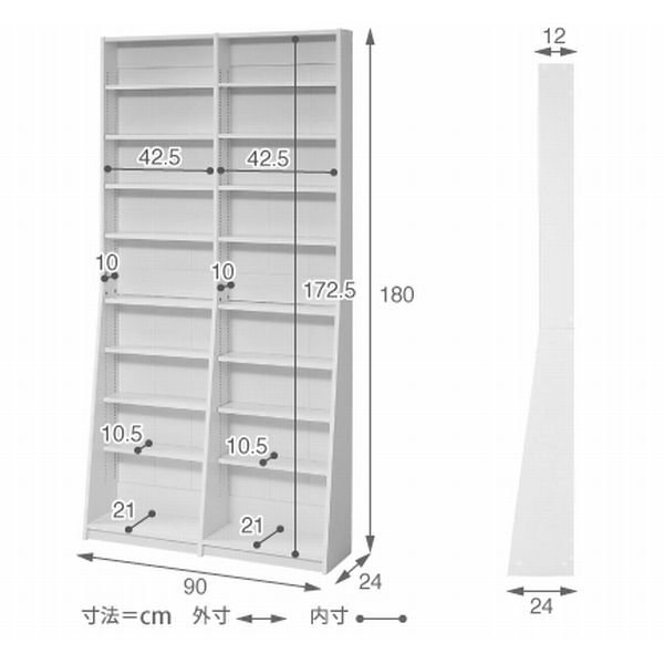 【カラー】 ダークブラウン、ライトブラウン、ホワイト 【サイズ】 <外寸> 幅90×奥行24×高さ180cm <内寸> オープン部:幅42.5×奥行10~21×高さ172.5cm 可動棚:幅42.5×奥行10.5×厚み1.5cm(1cmピッチ138穴) 【材質】 本体:プリント紙化粧合板 【耐荷重】 可動棚:各(約)5kg以下 収納量:文庫本(約)504冊、コミック(約)504冊 【生産国】 ベトナム 【梱包】2梱包でお届けします。 2-1 サイズ:106×41×8cm、重量:13.5kg 2-2 サイズ:51×46.5×13.5cm、重量:14.5kg 【その他】 ・可動棚:16枚 【組み立て品】 お客様による組み立てが必要です。 【ご注意】 ・サイズ、重量は概算です。 ・商品カラーはご使用のモニターによって実際の明るさや色と異なって見える場合がございます。 |