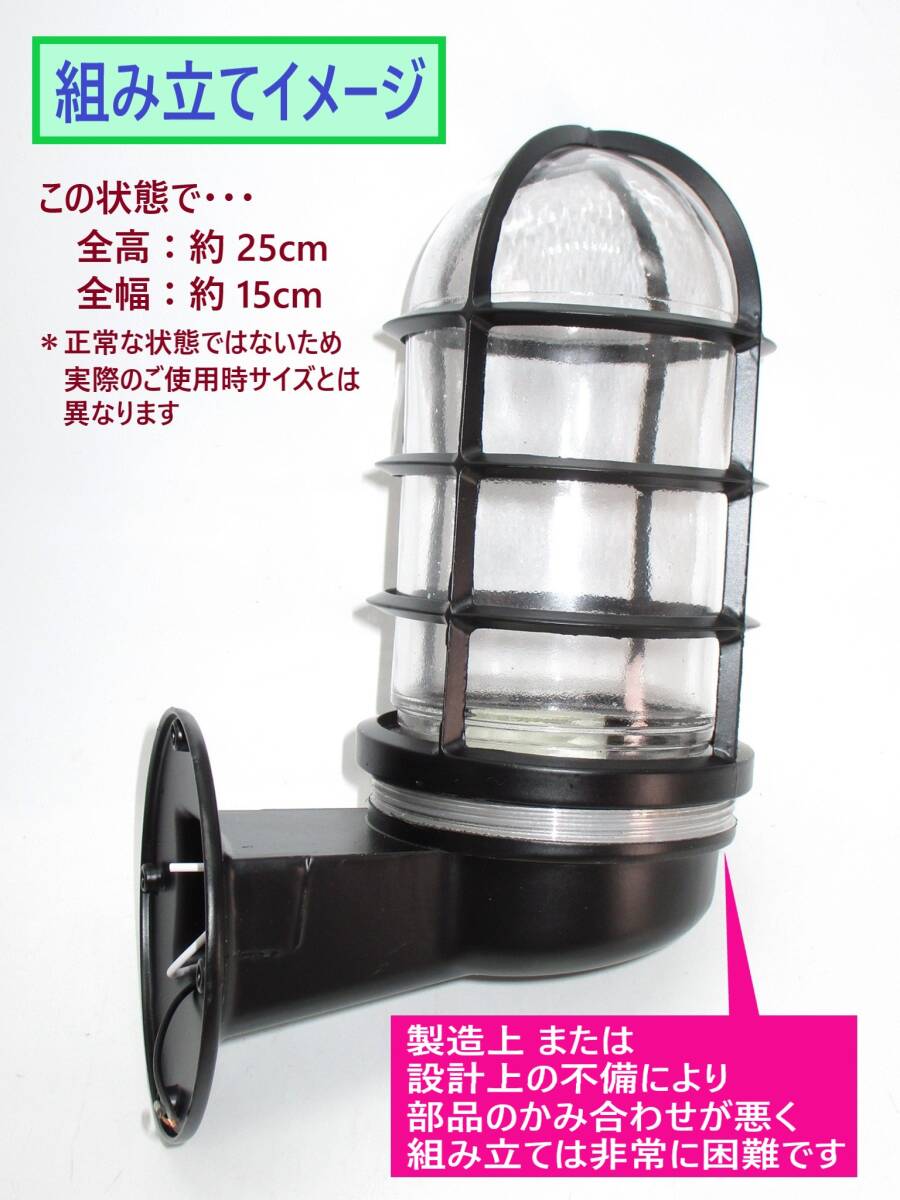こちらのお品は 「ジャンク/製造不備/破損/動作未確認」 です。 製造不備 もしくは 設計上の不備により 商品の組み立て自体が 非常に困難な状態です。 *具体的には 「ガラスカバー」と「土台部品」のかみ合わせが悪い状態です そのため 「フレームカバー」を正常にセットする事が出来ません (参考/画像3・4 他) ガラスの加工技術をお持ちの方でしたら かみ合わせの調節など 対応していただけるかもしれません。 また 「フレームカバー」のみでしたら 組み立ては可能ですので 知識や技術のある方でしたら 「ガラスカバー」無しでの使用への安全な改造も可能かもしれません。 以下の商品説明・画像をよくご確認いただき ご検討をお願いいたします。 ******************************** 未使用品です。 外箱・保護材などは ありません。 レトロデザイン・アンティーク風の 壁掛け照明です。 設置には 電気工事士による電気工事が必要になります。 [電池やコンセントではお使いになれません] 電球は付属していませんので お好みの物をご用意下さい。 [電球口金サイズ/E27・LEDランプ・省エネランプ・白熱電球等対応] 設置や仕様に関する説明書は 付属しておりません。 設置に工事が必要な関係上 動作確認はしておりません。 今回のお品は 「ガラスカバー」に「割れ・欠け」が見られます。 手指を傷つけないよう 充分にご注意ください。 また、海外製につき 作りや切断面の処理等に粗さ・歪み・ 部分的な色剥げ・スレ・キズ等の傷みがある場合があります。 これらの点より、修理のできる方、部品取りにご利用になりたい方など、 「ジャンク」「知識のある方向け」として出品いたします。 ご了承ください。 以下の商品説明をよくご覧になってから、ご検討をお願いいたします。 神経質な方、完品をご希望の方は、御入札をご遠慮ください。 【商品内容】 レトロデザイン アンティーク風 ブラケットライト 《壁掛け照明/黒》 サイズ: 画像3の状態にて 約 25cm×15cm *正常な組み立て状態ではありません 重量: 約 600g 素材: フレーム/ダイキャスト-アルミニウム・カバー/ガラス 他 口金: E27 その他: 海外製/メーカー等の詳細は不明 動作未確認 説明書なし 取り付けのための「ネジ+アンカー」不足 [本来は 4セット付属] 取り付けは電気工事士による電気工事が必要です 資料によれば *室内・室外対応 *上向き・下向き どちらでの設置も可(屋外使用の場合は下向きで) *金属部には 防水・防錆処理 *LEDランプ・省エネランプ・白熱電球対応 *状態などは画像にてご確認ください *実際の商品の色味とは異なる場合があります 【状態等】 ・未使用品です。 ・外箱・保護材などは ありません。 ・海外製の為、作りや切断面の処理等に粗さ・歪み・ 部品縁の処理(バリ)など、作りの粗さがある場合があります。 また、多少の塗装剥げ・製造上のキズ等がある場合があります。 あらかじめご了承ください。 ・長期保存品につき、汚れ・埃の付着等がある場合がありますが、 御容赦下さい。 ・「ガラスカバー」に「割れ・欠け」が見られます。 ・当方はこちらのお品に関しましての知識を持ち合わせておりませんので、 商品の仕様に関するご質問にはお答えできません。 また、当方が把握していない不備がある可能性がありますが、 そういった不備には一切サポートができません。 あらかじめご了承ください。 以上の点より、修理のできる方、部品取りにご利用になりたい方など、 「ジャンク」「知識のある方向け」として出品いたします。 ご承知をいただける方のみ、 ノークレーム・ノーリターンにてご検討下さい。 【補足】 「ジャンク」という表現は、 「本来の利用価値が損なわれた物」「正常な動作を保証しない物」 「保証対象外の物」を意味する言葉として使用しています | ||