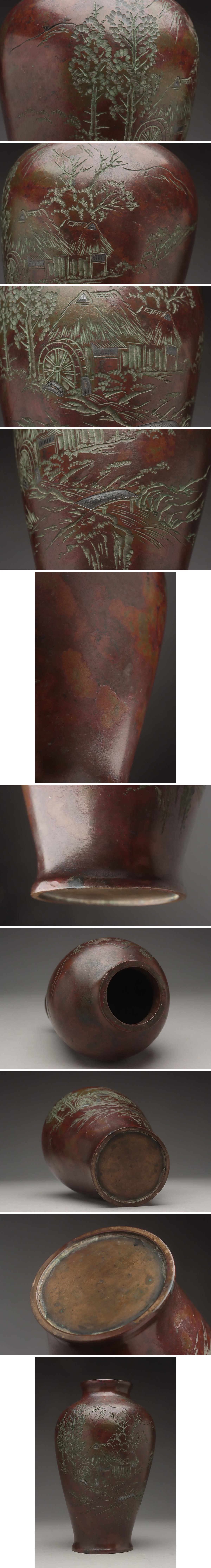 | ◆ 時代金工 斑紫銅 銀象嵌 片切彫 山水風車小屋図 花瓶 高19.2cm・斑紫銅花入・花生 古美術 ◆