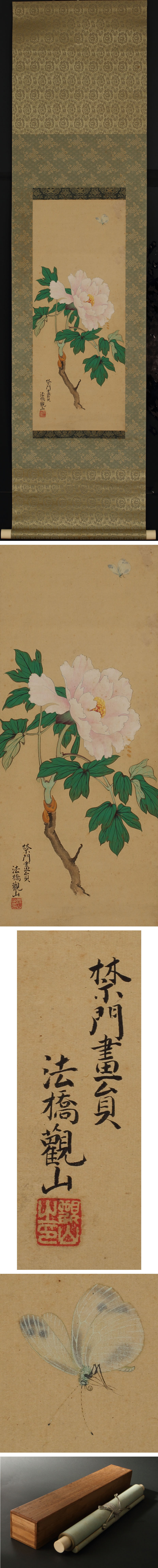 佐藤観山の花卉画です。 「富貴長春」の象徴である、牡丹と蝶を画いた一幅です。大和絵と墨絵、写生画の折衷がみられ、牡丹の接ぎ木や蝶の触角など細部に至るまで、精緻な観察と画力が顕われております。 観山は江戸後期の会津若松城下に生まれ、幼少より画を好み単身京へ赴き、「時の大家」に就き法橋位を得たことから「法橋観山」と呼ばれました。 郷里ではときの家老簗瀬三左衛門から杉戸絵に桜の絵を描くことを命ぜられましたが、権勢に阿るのを嫌った観山は、簗瀬が忌み嫌う蛙に似た巨岩を桜とともに描き、描き直しにも応じなかったという逸話が知られます。(『若松市史』)その師系は「円山派(四条派)」らしいこと以外は不詳ですが、京都・本法寺に白梅図小襖を描いていることが知られ(『社寺調査報告 21(本法寺)』)、本法寺にゆかりの深い岸派の絵師であったことが推察されます。 観山は幕末期の会津画壇に「雷鳴海内」とその実力を謳われた人物でありますが、維新期の混乱により多くの作品や晩年の消息を伝える資料が失われたとみられます。今後の研究が俟たれる逸品です。 ◆佐藤観山 江戸後期の絵師。会津若松の人。幼少より画を好み京都へ遊学。法橋位を得たことから「法橋観山」を称す。時の番付で「雷名海内」と称されたが、独立不羈で権勢に阿ることを嫌う剛直な性格でも知られた。代表作に「白梅図小襖」(京都本法寺蔵)、「宝船図」(福島県立博物館蔵)。 付属:時代が付属します。 寸法:高さ156cm、幅39cm(最大幅。若干の誤差はご了承下さい) 状態:経年のイタミ・シミがございます。 |
