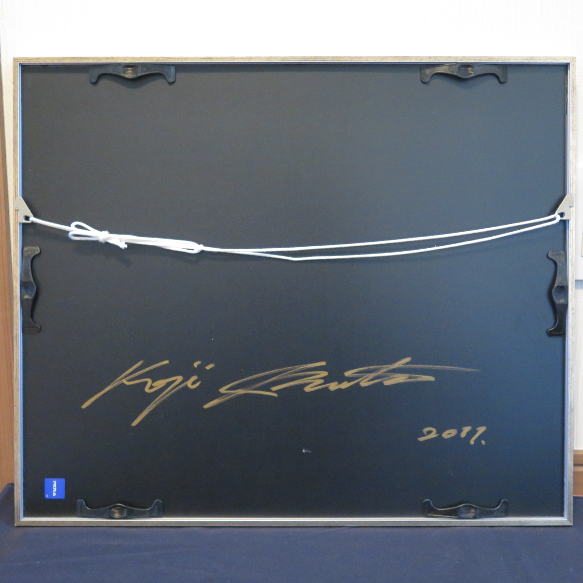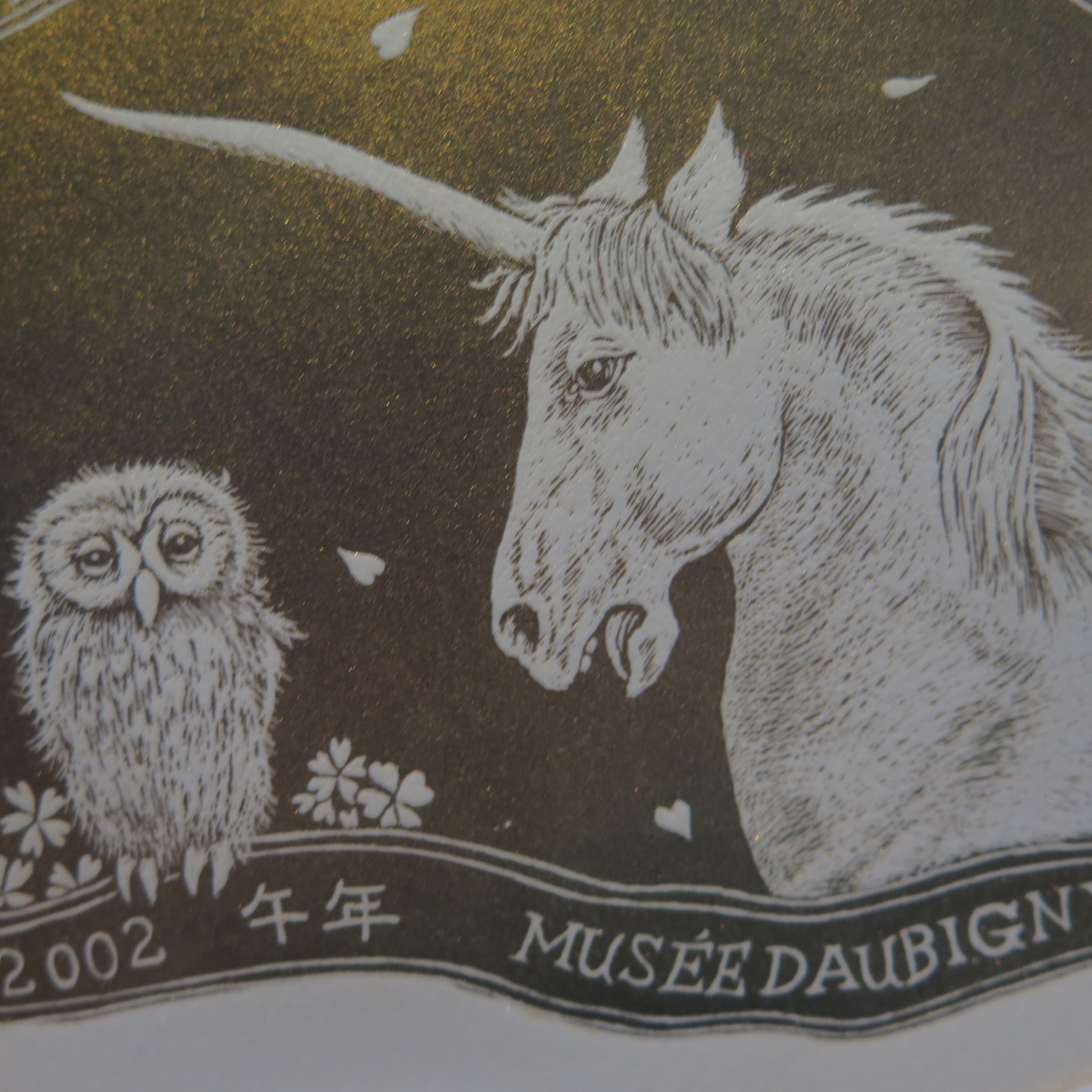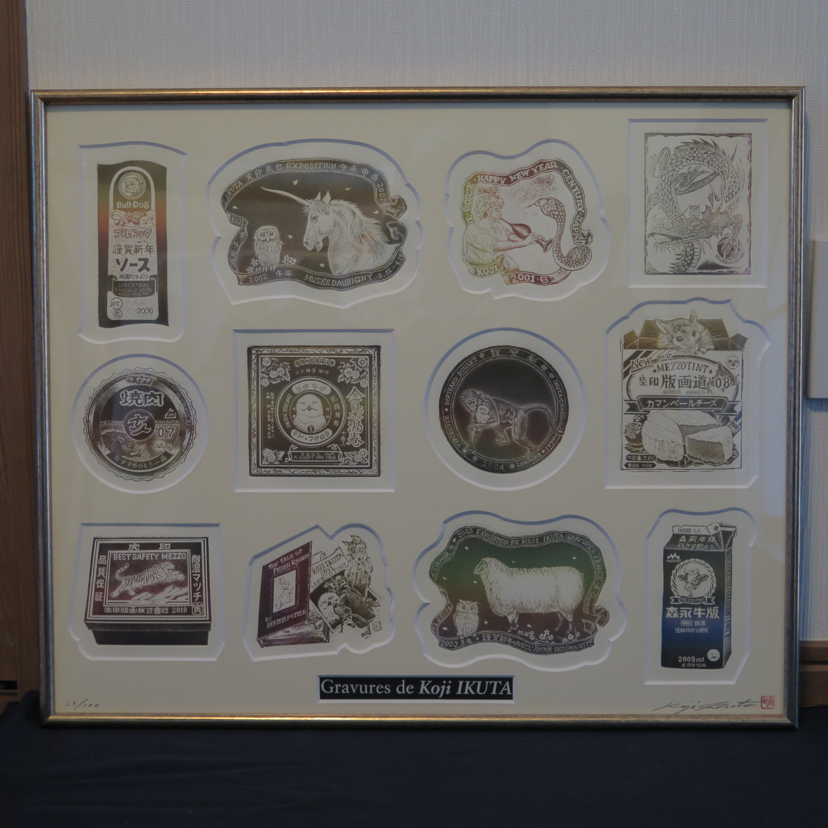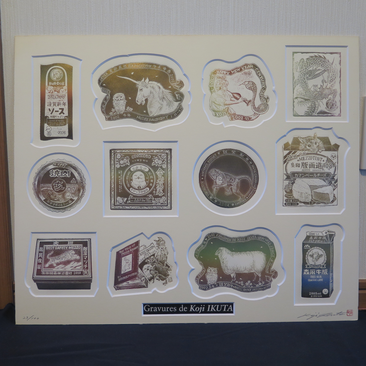 作品は【 十二支年賀版画 】干支を世におなじみの製品で表現したユニークな作品。今年の馬、来年の羊、酉年のフクロウなど十二支揃っています。干支なので猫おらず虎はいます。稀少なカラーメゾチント、金属光沢の色が見る角度で変化します。作家本人からの購入です。マット裏の全面が紙で覆われておりはがすことはできません。隙間から確認したところ、1枚のシートに12図が刷られています。画面50*41㎝(10号大弱)画面に刷り込みサイン、各作品に年記2000~2011。マットにサインと印、限定エディション23/100。マットサイズ54.8*45.7㎝、シートサイズはこれよりもやや小さめです。見える限り状態は良好です。額裏板にもサイン、年記2011。額装サイズ56.8*47.1*2.3㎝。前面はアクリルで総重量1.8㎏と軽量、簡単・安全に飾っていただけます。アクリルわずかにすり傷あるも目立たず、それ以外は良好な状態です。かぶせ箱が付属します。