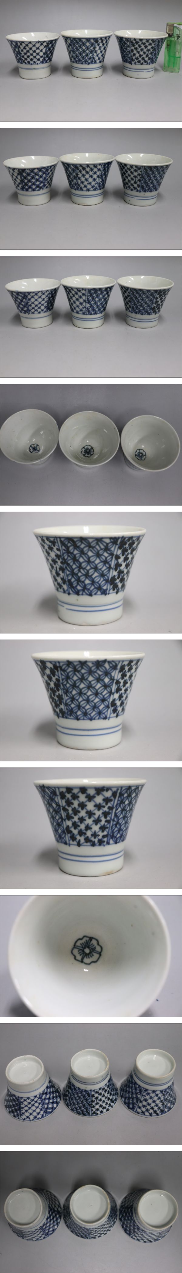 | 商品説明 | 商品名 江戸期 七宝繋ぎ四割花文 蕎麦猪口 三客 付属品:なし。 サイズ:高さ6.7cm、口径8.3cm、底径5cm。 状態: 時代のスレのみ無疵になります。 |