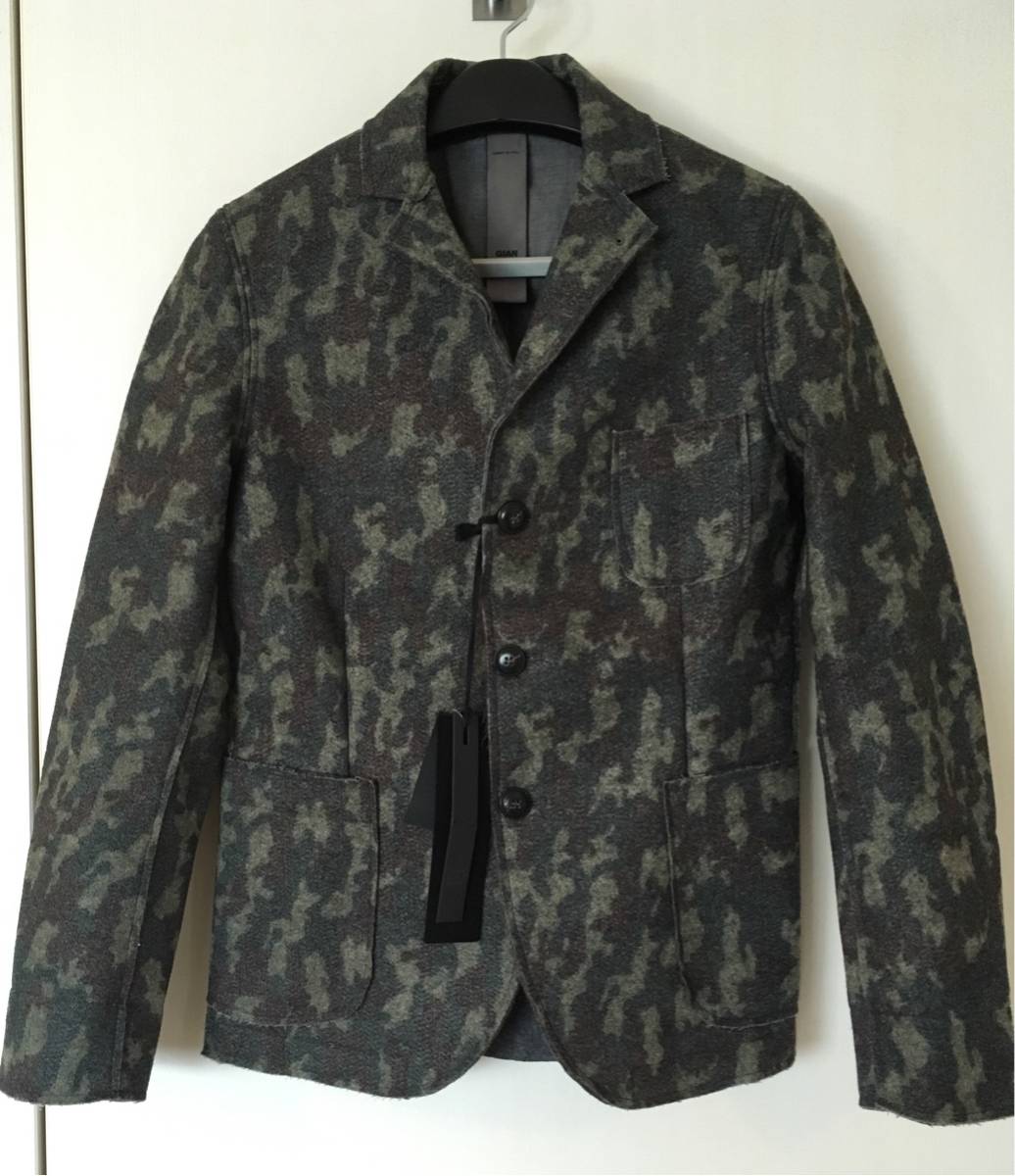 こちらはカモフラージュ総柄の厚みがあり、端が切りっ放しになった生地に、大きめの三つボタン留めを採用したセンターベントのジャケットになります。