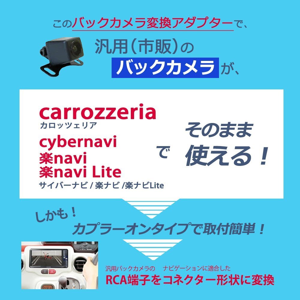 ![]() カロッツェリア ナビに使用できる 「バックカメラアダプター」です (汎用品ですので純正品と形状は異なります) ■ナビゲーションの交換 ■純正カメラは値段が高い ■前の車両で汎用カメラを使用していた ■ナビはそのままで汎用バックカメラを取り付けたい などに RCA端子でないバックカメラ専用入力に RCA映像出力を装備したバックカメラユニット(ND-BC7/BC30II等)を接続するための変換コネクターです 簡単取付のカプラーオンタイプ ナビ本体にガイドライン表示機能がある機種はガイドライン表示が可能ですので、ナビ側にて設定を行って下さい 設定方法は各ナビゲーション販売店様へご相談ください ※ サイバーナビやEV用ナビにバックカメラユニット「ND-BFC200」または「ND-BC100II/BC100」を接続する場合は必要ありません。 ※ 取付は自己責任で行ってください 誤った取付をされると車両に重大な支障をきたす場合がございます その場合は、当方は一切の責任を負いません ※ すべての社外カメラとの組み合わせの動作を保証するものではございません ※ 取付可能なカメラはRCA(映像)端子付きCMOSカメラです ※ CCDカメラにはカーナビ自体が対応しておりませんので取り付けする事は出来ません ※ 取り付け箇所がナビ背面ではない場合があります。説明書・配線仕様図などをご確認ください。 ![]() |