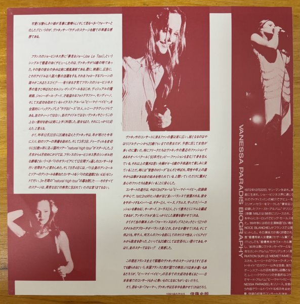 ※1992年10月25日に3rdアルバムがリリースされ、翌年3/3ドゥーヴィルを皮切りに初の仏国内ツアー「Natural High Tour」がスタート、3ヶ月で幕を閉じました。その年の夏に待望の初来日コンサートが決定し、その頃にリリースされたフライヤー(プロモシート?)の切り抜きです。残念ながら他の部分は見当たらずでした。 なお、元々はClaire Perdigonの販促物と思われる色紙サイズPOPと額縁のセットの上から、VANESSA PARADISの切り抜きを入れておりました。Claire PerdigonのPOPもお付けいたします。 ・VANESSA PARADIS切り抜き(W197×H198.5) ・額縁 (外寸 W213×H213×D12/窓寸 W181×H181) ・Claire Perdigon色紙サイズPOP(199×199) ・発行元 : POLYDOR / PHILIPS ・発行年月日 : 1993年 |