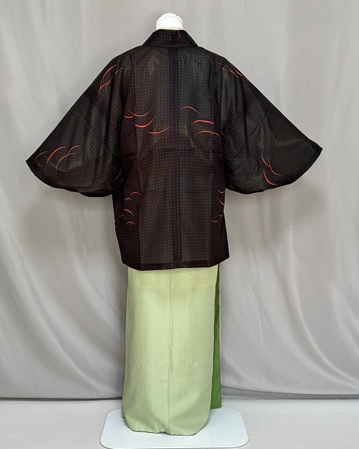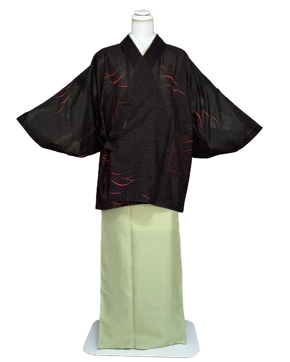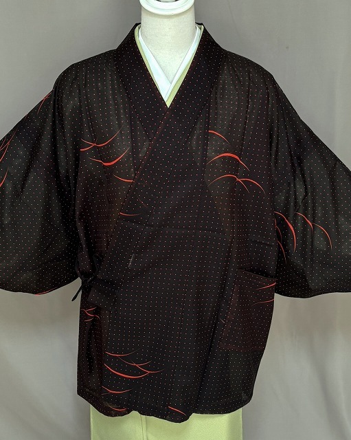 | M0616-08 河句野 ポリエステルの絽の生地にてお仕立ていたしました和装コ-トです。 ポリエステル素材なので「シワ」「汚れ」などを気にせず着用することができます。 お袖も船底型ですので活動的に動きやすいと思われます。 和装だけでなく洋装時に冷暖房対策として着用されてもオシャレだと思います。 こちらは問屋様よりの在庫処分のお品となっております。 目立つ難は判りませんでしたがご理解の上でお求めくださるようお願いいたします。 お色は朱色系が入った黒色系地に細かな水玉の柄やつゆ芝の柄となっております。 左側上前にポケットが付いております。◎ | ||||||||||