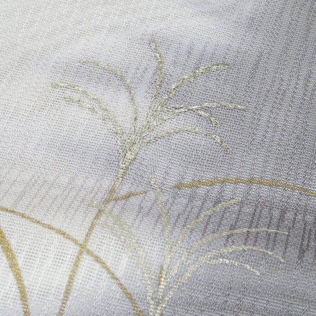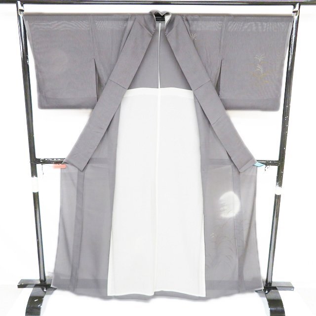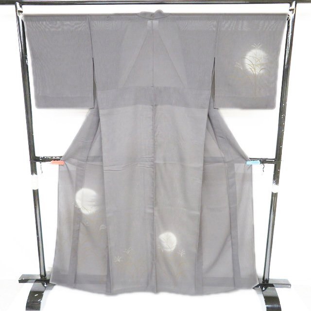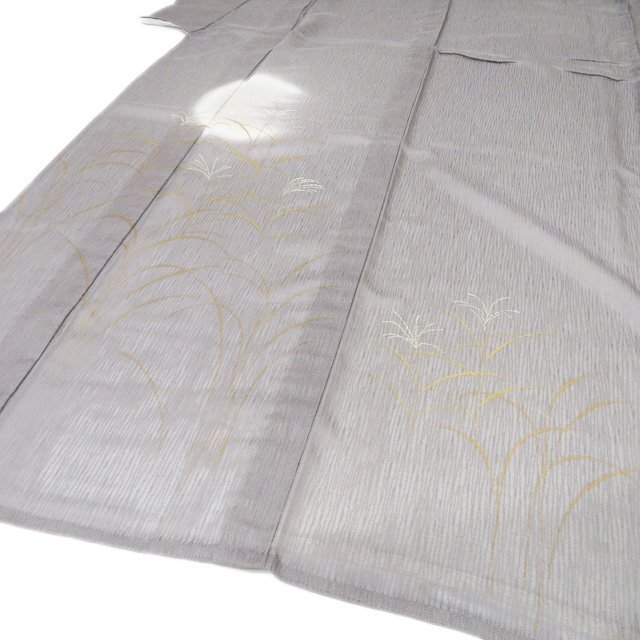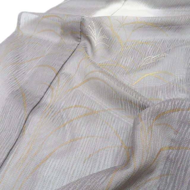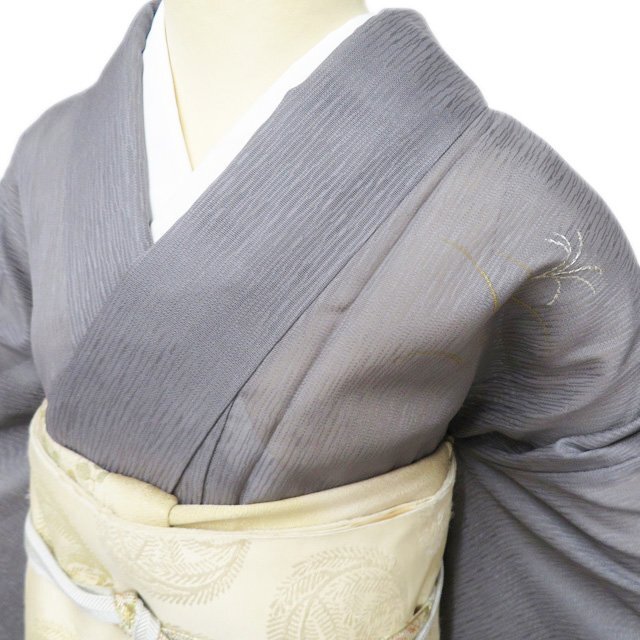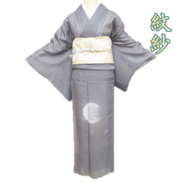 丈162.5cm(+7) 裄68cm(+0) 袖丈48.5cm(+6) 前幅24.5cm 後幅30cm ※サイズのお直し、承ります。 (身丈のみ、身幅のみのお直しは承っておりません) ※身丈は肩から測っております。 ※()内は※()内の数字はお直しで直せる長さを示しています。お仕立て直しの場合は胴裏を付け替えるため、さらに長く直せる場合があります。詳しくはお問い合わせください。 単位:cm 素材 正絹 商品ランク B ●着用時期 7月、8月(+-2週間) ●着用シーン 披露宴、パーティー、お出掛け、式典など ●お色 灰色 金銀 主に西陣、桐生などで生産されている、紗地に文様を織り出した先染めの織物【紋紗】。 薄く、目が透いているので通気性に優れているので盛夏にお召しになっていただくのにぴったりなお着物です。 涼やかな夏のお洒落をお楽しみください。 居敷当の一部に薄シミがございますが、他は綺麗でまだまだご着用いただけるお品物です。 居敷当ての付いたお品物です。 涼やかな和のお洒落をお楽しみくださいませ。 写真に写っている着物のみの販売で、帯等の付属品はついておりません。 一部商品は実店舗・他サイトでも並行して販売しておりますので売り切れの際はご了承ください。 その他多数販売中 ho- | ||||||
