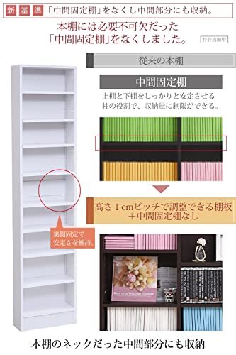 | 商品説明 | サイズ:[外寸]幅41.5×奥行16.5×高さ180.5cm 素材・材質:[本体]プリント化粧繊維板 サイズ:[内寸](オープン部)幅37.5×奥行14.5×高さ167.0cm/(可動棚)幅37.5×奥行15.0×厚み1.7cm(1cmピッチ上下各61穴)/(幅木避け)奥行2.4×高さ8.0cm 耐荷重・収納量:【耐荷重】[可動棚]約5kg以下/【収納量】[文庫]約225冊/[コミック]約175冊/[CD]約333枚/[DVD]約175枚/[Blu-ray]約196枚 備考:可動棚:8枚/設置する際には、本体が転倒しないよう、I字プレートで必ず壁と固定してください。 組立時間(目安)(大人2人):お客様組立(30分) ・コンパクトで大容量の壁面収納本棚 ・書斎やリビングなどシーンに合わせてCDやDVD、漫画の収納にお使いいただけます ・お色味は清潔感あるホワイト、落ち着きのあるダークブラウンの2色をご用意しています