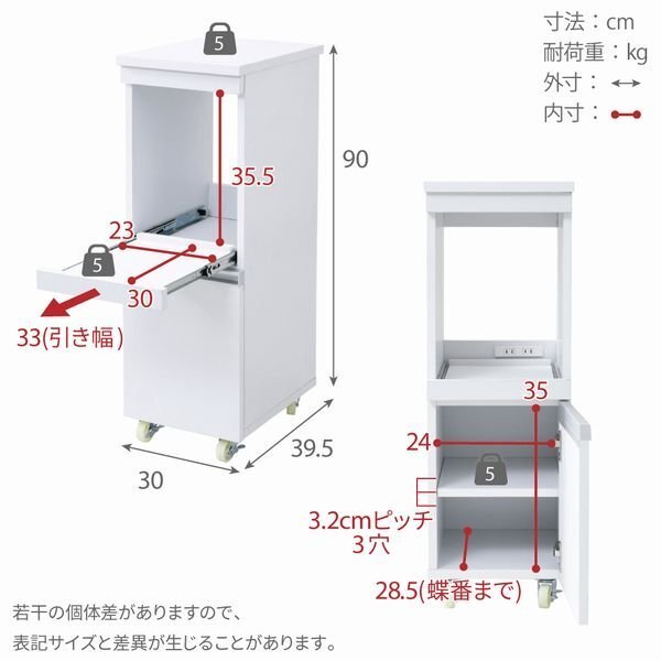| 【カラー】 ホワイト、ホワイト×ダークブラウン 【サイズ】 <外寸> 幅30×奥行39.5×高さ90cm <内寸> スライド部:幅23×奥行30×高さ35.5cm スライド引き幅:33cm 扉内:幅24×奥行28.5×高さ35cm 可動棚:幅25.5×奥行33×厚み1.8cm(3.2cmピッチ3穴) 【材質】 天板・前板・スライド棚:合成樹脂化粧合板(PVC) 本体:プリント紙化粧合板 【耐荷重】 天板:(約)5kg以下 スライド棚:(約)5kg以下 可動棚:(約)5kg以下 【生産国】 中国 【梱包】 サイズ:89.5×40×17.5cm、重量:14.4kg 【その他】 ・背面化粧有り ・可動棚:1枚 ・合計1500Wの2口コンセント付き(コード長さ196cm) ・キャスター4個(うち2個ストッパー付き) 【組み立て品】 お客様による組み立てが必要です。 【ご注意】 ・サイズ、重量は概算です。 ・商品カラーはご使用のモニターによって実際の明るさや色と異なって見える場合がございます。 |