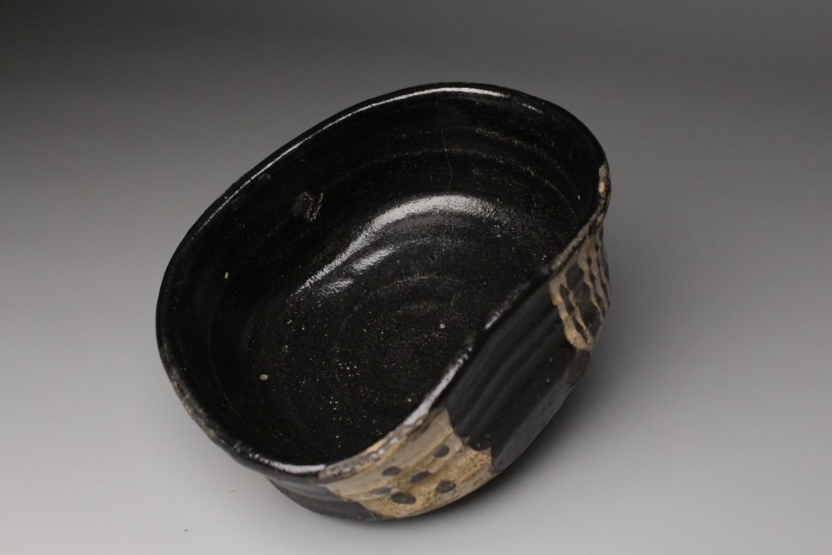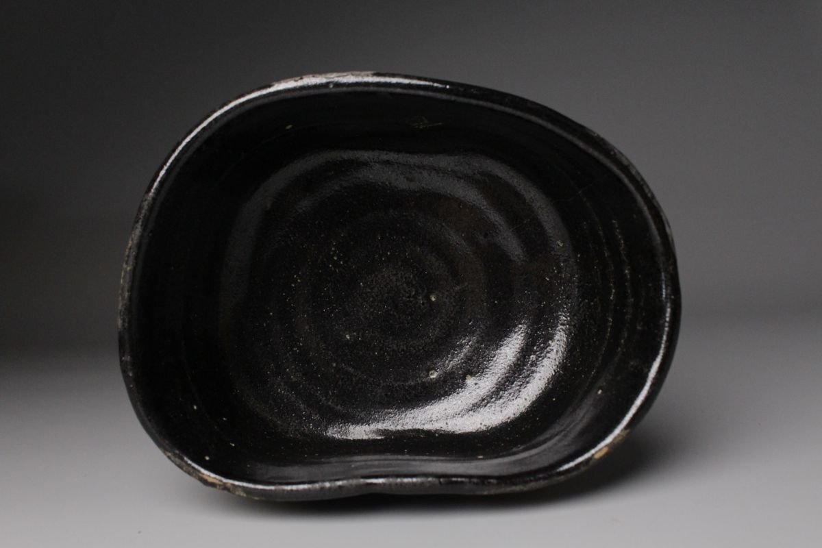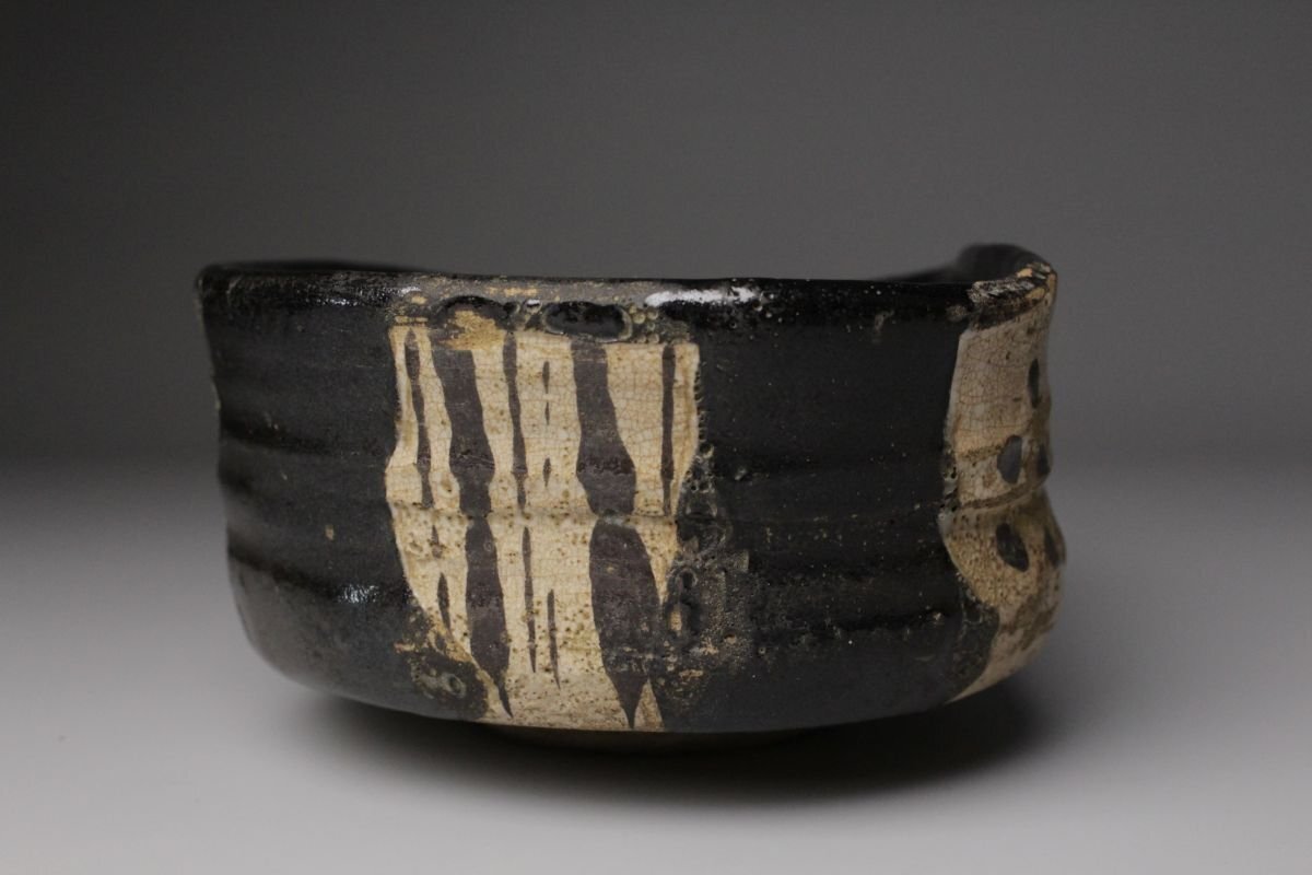 [.WI]25.09 25090555 T* * * 商品詳細 * * * ここでしか出逢うことのできない唯一の美をご紹介させて頂きます。 こちらは 古織部 黒織部 幾何学文沓茶碗 でございます。 織部焼は桃山時代の茶陶を代表する革新的な様式であり、その中でも黒織部は深みのある黒釉を基調とし、力強さと静謐さを兼ね備えています。本作はさらに「沓形」という独特の造形を取り、非対称的な歪みの美が、織部の自由闊達な精神を見事に映し出しています。 全体を覆う黒釉は、光を吸い込むように深淵でありながら、使い込むほどに艶を増し、抹茶の緑を鮮烈に引き立てます。胴部に配された幾何学文は、抽象的でありつつも端正なリズムを刻み、黒の静けさに動きを与える役割を果たしています。 沓茶碗ならではの偏平で伸びやかな形は、侘びと破調の美を強調し、茶席に置かれた際に強い存在感を放ちます。織部特有の前衛性と、黒釉の沈着な表情が相まって、茶の湯の場において格別の趣を添える逸品でございます。 この機会に是非お手元にてご堪能ください。 ■商品内容/ 茶碗、箱 ■サイズ/横16㎝×高7㎝×奥行11.5㎝ 箱:横18㎝×高10.5㎝×奥行14.5㎝ ■状態/ 経年によるスレ、小傷、汚れ、窯被 箱にスレ、小傷、汚れがございます。 ※写真にてご確認、ご了承の上ご入札下さい。
