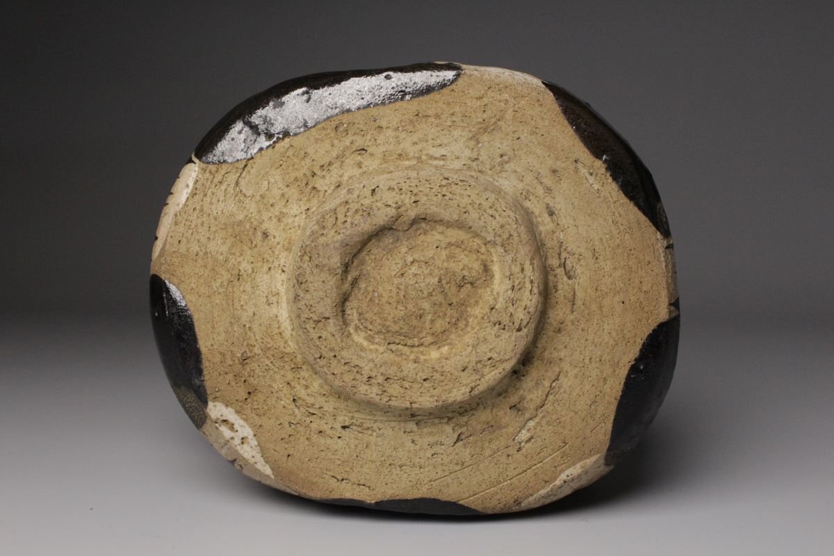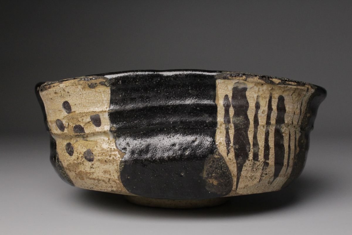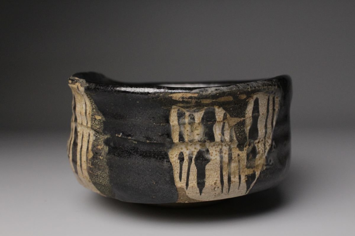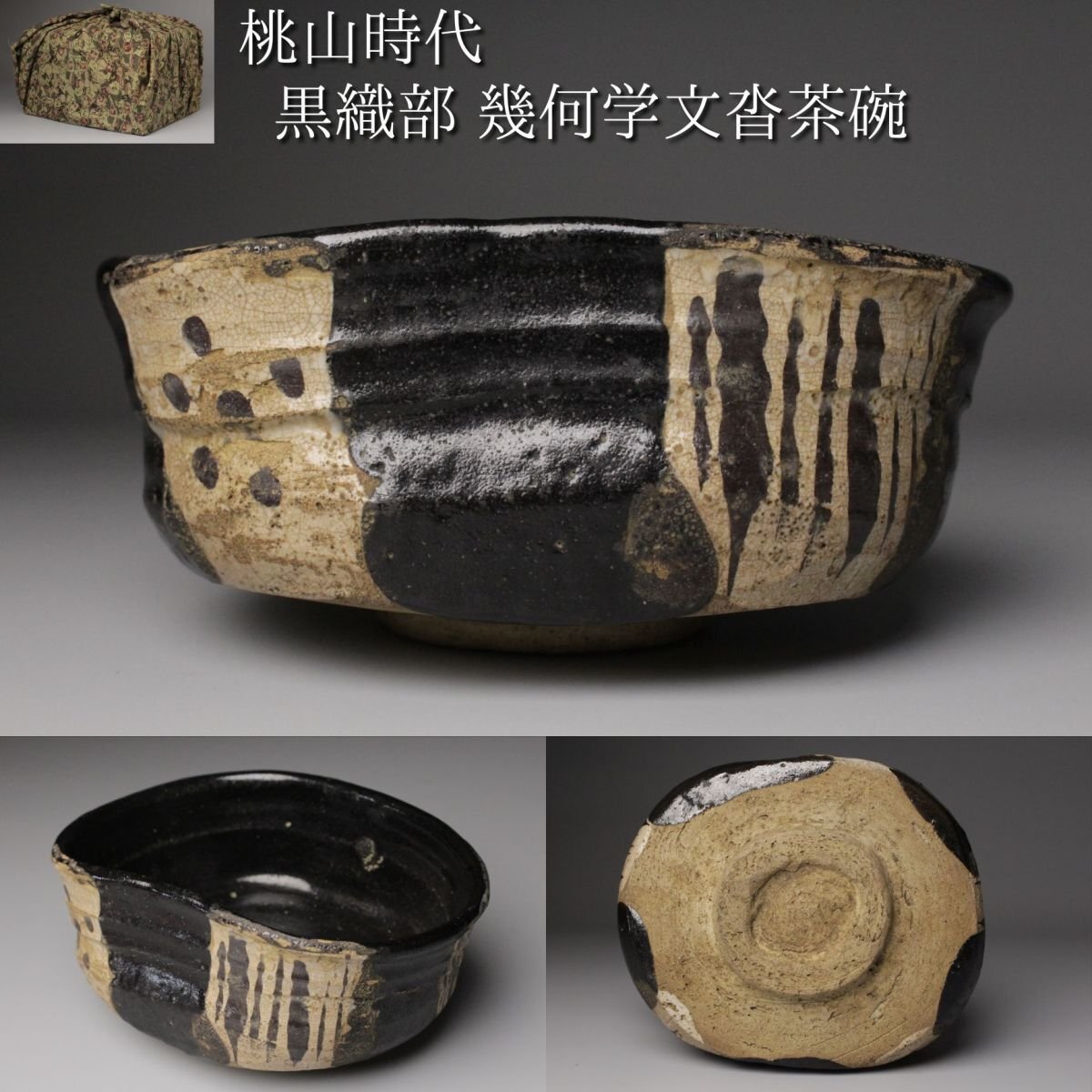 [.WI]25.09 25090555 T* * * 商品詳細 * * * ここでしか出逢うことのできない唯一の美をご紹介させて頂きます。 こちらは 古織部 黒織部 幾何学文沓茶碗 でございます。 織部焼は桃山時代の茶陶を代表する革新的な様式であり、その中でも黒織部は深みのある黒釉を基調とし、力強さと静謐さを兼ね備えています。本作はさらに「沓形」という独特の造形を取り、非対称的な歪みの美が、織部の自由闊達な精神を見事に映し出しています。 全体を覆う黒釉は、光を吸い込むように深淵でありながら、使い込むほどに艶を増し、抹茶の緑を鮮烈に引き立てます。胴部に配された幾何学文は、抽象的でありつつも端正なリズムを刻み、黒の静けさに動きを与える役割を果たしています。 沓茶碗ならではの偏平で伸びやかな形は、侘びと破調の美を強調し、茶席に置かれた際に強い存在感を放ちます。織部特有の前衛性と、黒釉の沈着な表情が相まって、茶の湯の場において格別の趣を添える逸品でございます。 この機会に是非お手元にてご堪能ください。 ■商品内容/ 茶碗、箱 ■サイズ/横16㎝×高7㎝×奥行11.5㎝ 箱:横18㎝×高10.5㎝×奥行14.5㎝ ■状態/ 経年によるスレ、小傷、汚れ、窯被 箱にスレ、小傷、汚れがございます。 ※写真にてご確認、ご了承の上ご入札下さい。