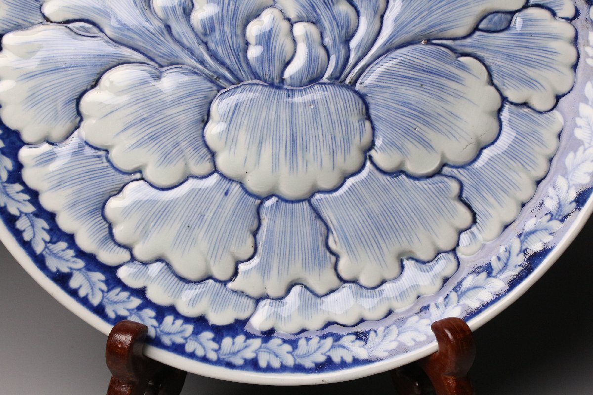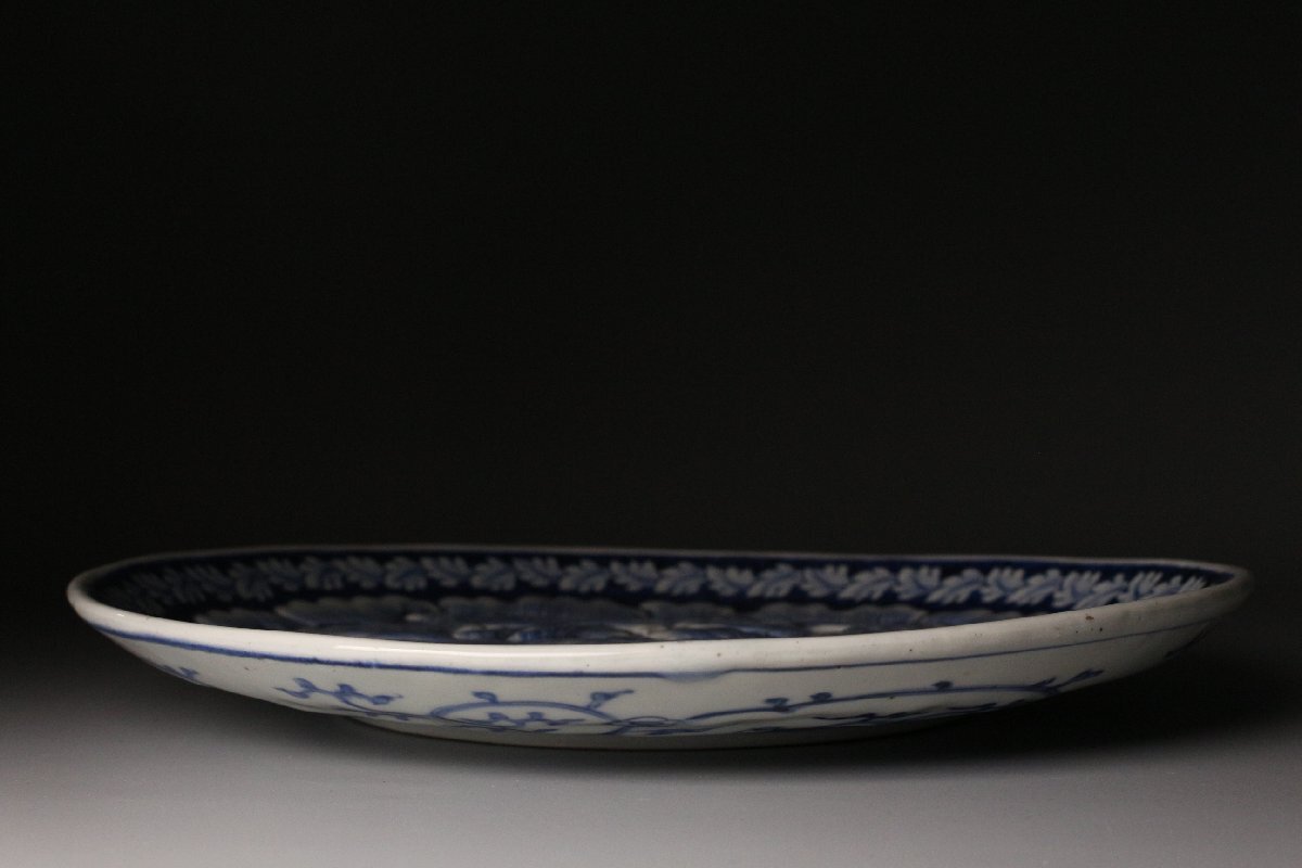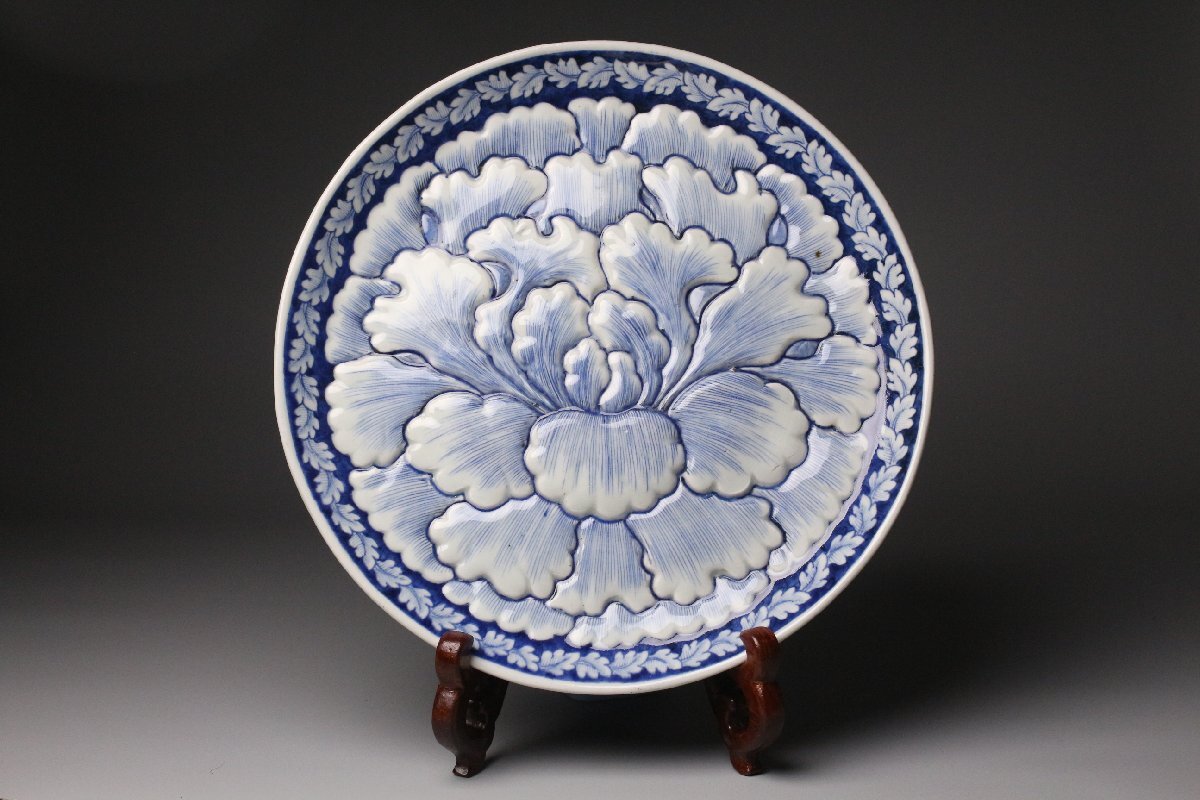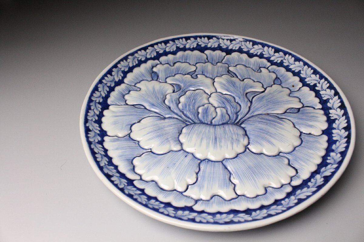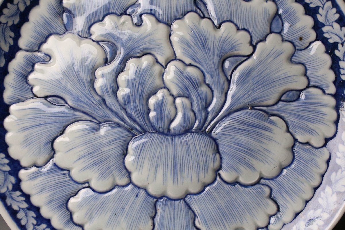 [.QR]25.11 25111101T* * * 商品詳細 * * * ここでしか出逢うことのできない唯一の美をご紹介させて頂きます。 直径30cm、堂々たる姿で魅せる古伊万里・染付の陽刻牡丹文大皿。 画面いっぱいに施された牡丹の陽刻は、まさに浮かび上がるような立体感をもち、 光のあたり方で陰影が際立ち、染付の藍と共に優美な景色を生み出しています。 陽刻によって添えられた力強さと、染付の柔らかな筆致が見事に調和し、 ただの装飾を超えて、器全体が華やぎを帯びたような存在感を放ちます。 古伊万里の美を存分に楽しみたい方に、ぜひ手に取っていただきたい作品です。 ■サイズ/横30㎝×高3.5㎝ ■状態/経年による スレ、小傷、汚れがございます。 ※写真にてご確認、ご了承の上ご入札下さい。 ※皿立ては付属致しません。