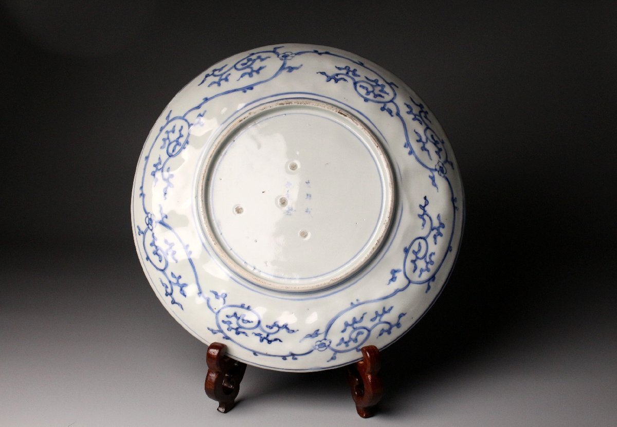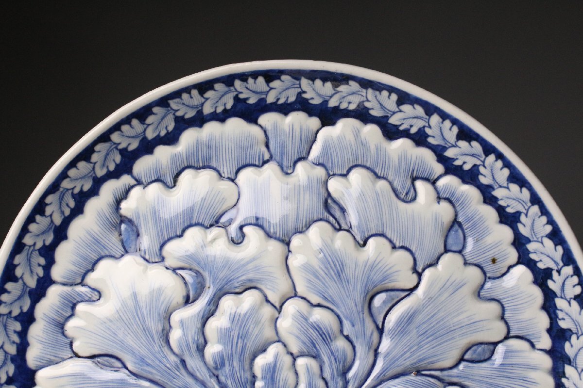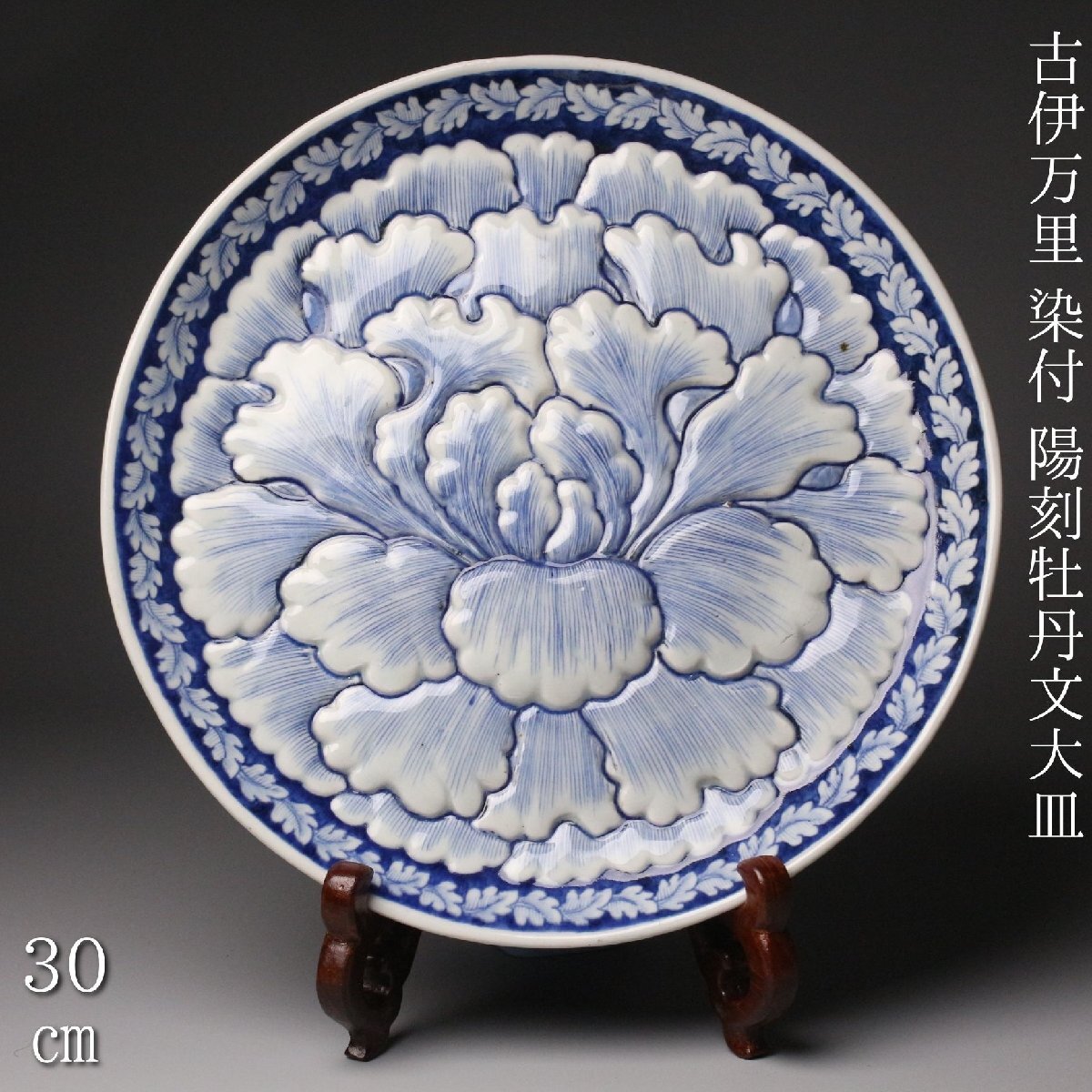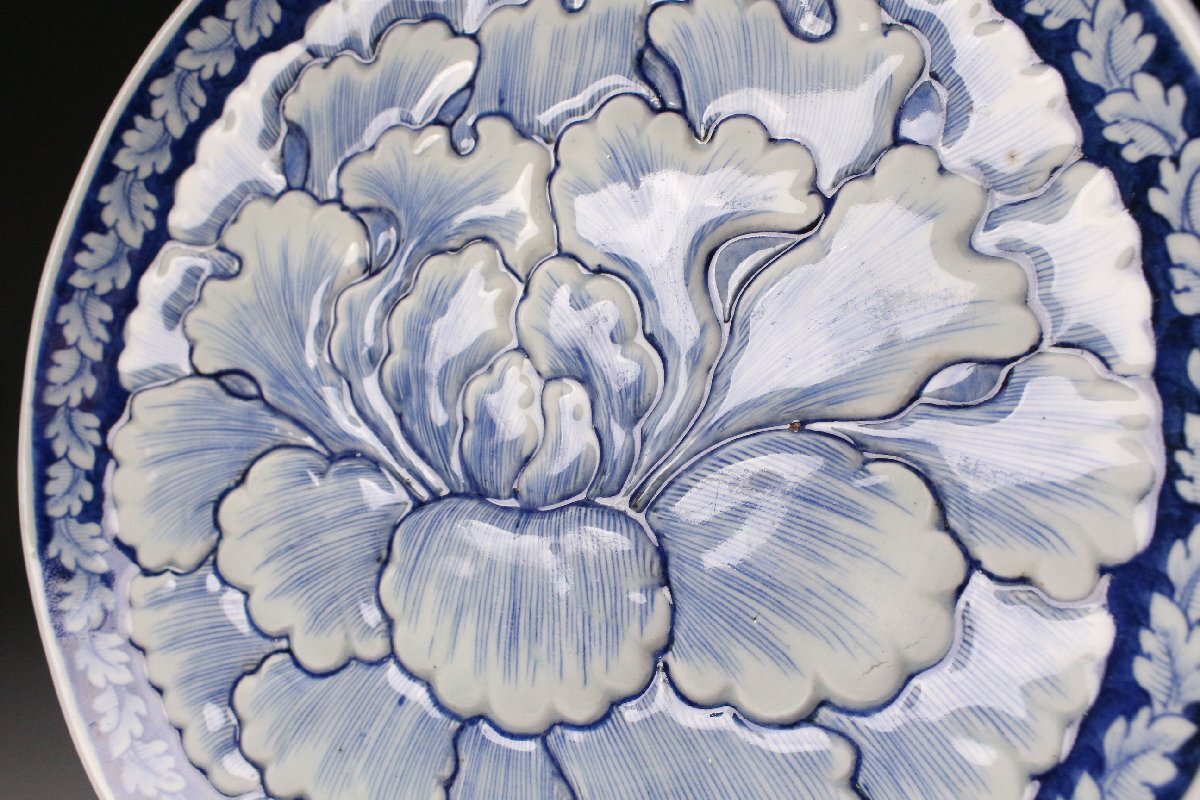 [.QR]25.11 25111101T* * * 商品詳細 * * * ここでしか出逢うことのできない唯一の美をご紹介させて頂きます。 直径30cm、堂々たる姿で魅せる古伊万里・染付の陽刻牡丹文大皿。 画面いっぱいに施された牡丹の陽刻は、まさに浮かび上がるような立体感をもち、 光のあたり方で陰影が際立ち、染付の藍と共に優美な景色を生み出しています。 陽刻によって添えられた力強さと、染付の柔らかな筆致が見事に調和し、 ただの装飾を超えて、器全体が華やぎを帯びたような存在感を放ちます。 古伊万里の美を存分に楽しみたい方に、ぜひ手に取っていただきたい作品です。 ■サイズ/横30㎝×高3.5㎝ ■状態/経年による スレ、小傷、汚れがございます。 ※写真にてご確認、ご了承の上ご入札下さい。 ※皿立ては付属致しません。
