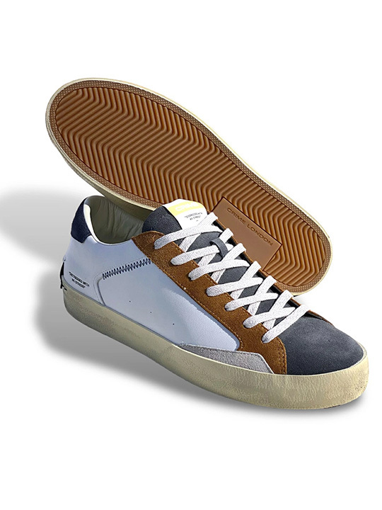 EAST LONDONの文化、音楽などのサブカルチャーにインスパイヤされて作られたブランド。 イタリアのセレクトショップでも多く取り扱われており、旬なエッセンスを巧みに取り入れたデザインが評価されております。 世界的に周知されており、日本でも雑誌媒体などで紹介されているラグジュアリーブランドとなっております。 そんな《CRIME LONDON -クライムロンドン-》の、永年愛されるローテク顔のベーシックなレザースニーカー。 差し色使いやジグザグステッチ、エイジングをかけたソールで不良さ薫らせた1足。 上質なレザーとイタリアらしいスマートなフォルムで品を漂わせており、絶妙な塩梅を足元で演出してくれます。 また、リッチな履き心地も魅力。2cmのレザーカップインソールやパイル素材を張ったライニングなど、 見えない部分も拘りをもって作り込んでおります。 タンやヒールにプリントされた「DISTRESSED WITH NO STRESS(ストレスのない苦悩)」は ロックの反骨精神が反映されててとってもクール。 ラグジュアリーな足元が手に入るレザースニーカーとなりますので、この機会に是非ご検討ください。 もちろん新品未使用正規品ので安心してお求めいただけます。