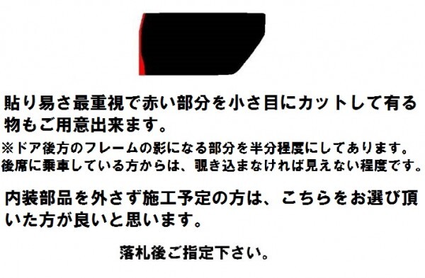 | リア3面は施工性良好ですが、ドア部分は初心者の方には少々難しいと思います。 ドア部分は通常サイズの他、貼り易さを最重視した小サイズもご用意出来ます。(画像2) 内装部品を取り外さず施工する場合、小サイズをお選び頂いた方が良いと思います。 落札後、ご指定下さい。 ※取り外し方の手順(画像付き)をお知らせさせて頂いています。 | ||