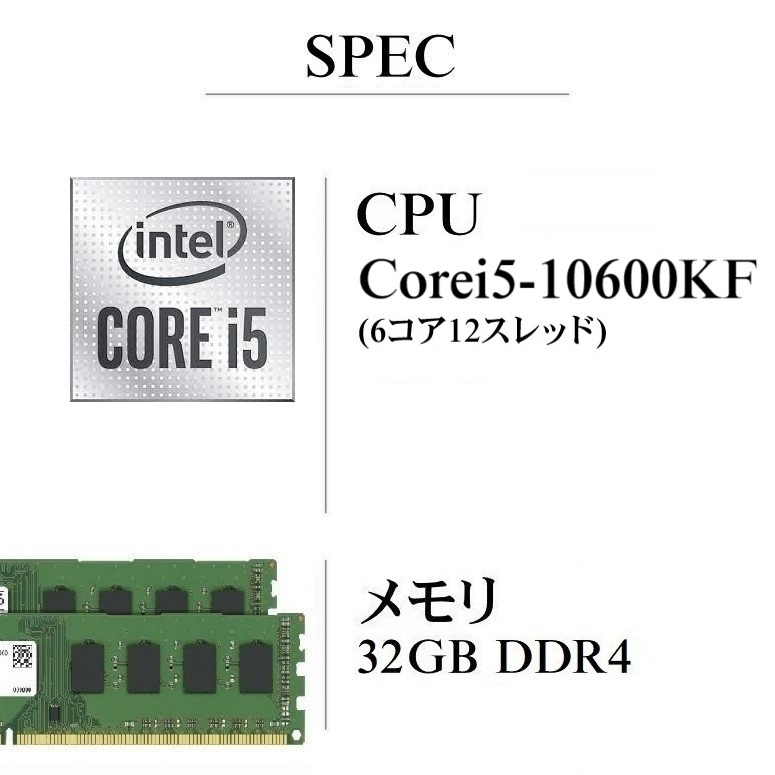 CPU::Corei5-10600KF GPU::nVIDIA QUADRO-K1200 DDR5-4GB メモリ:DDR4-32GB SSD: 新品M2:SSD1TB HDD: HDD-1TB DVD:DVD-RWドライブ WIFI:無線LAN デュアルバンド 2.4GHz 150Mbps/5GHz 433Mbps BT:Bluetooth4.2 Office:Office2024ProPlus OS:Windows11Ppo
