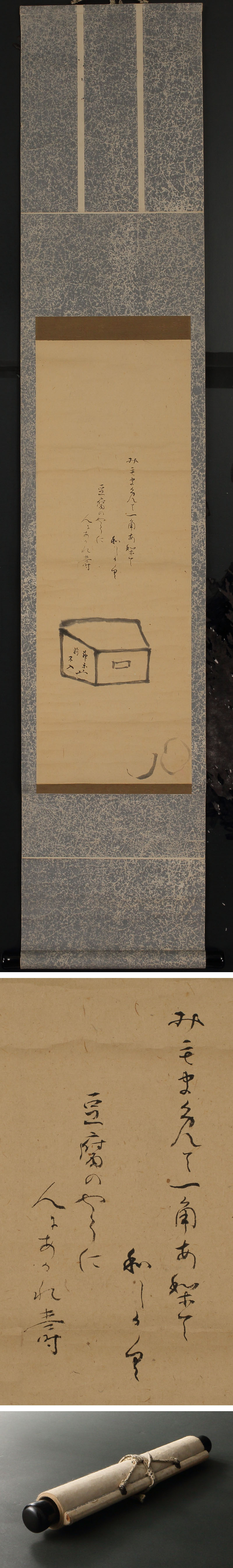 神楽岡不入の自画賛です。 棒手振(移動販売)の豆腐売が用いた「豆腐箱」を描き、「みもまめで一角ありて和(やわ)らかく 豆腐のやうに人にあかれず」と定家様風に着賛しております。落款「神楽丘前不入」は豆腐売の屋号のように書かれております。 不入といえば出雲松江藩主・松平不昧(治郷)との交流が著名ですが、不昧の豆腐画賛には「世の中はまめで四角で和らかで とうふのようにあきられもせず」と認められていることが知られます。また、不昧公の味覚として「朝は八盃豆腐に海苔、昼は焼豆腐にすり生姜、晩は湯豆腐にねぎ味噌」といった好みが夙に知られており、茶会の献立にも「焼豆腐」「今出川豆腐」などが見え、この上ない豆腐好きであったことが窺えます。 道具屋で地蔵菩薩の石像を買い、背負って帰る途中に不昧公と運命的な出会いを果たした不入。お殿様の不昧が「豆腐」、裏方の不入が「豆腐箱」を描いたというのも、単なる師弟の枠にとらわれない数寄者同士の共鳴を感じさせます。見事な逸品です。 ◆神楽岡不入 江戸後期の塗師。尾張または美濃の出身といわれる。号を不入・一声庵・無塵庵、通称を神楽岡(丘)不入といった。出雲国松江藩7代藩主・松平不昧の知遇を得るも、一度も松江には赴かなかったことから、「松江に入らず」の意で「不入」の号を賜り、以後「松枝不入」と名乗るようになった。作品は乾漆や象嵌等を併用した茶味のある物が多い。晩年は京都・神楽岡に隠棲した。嘉永3(1850)年没。 寸法:高さ135cm、幅26cm(最大幅。若干の誤差はご了承下さい) 状態:経年のイタミ・補修がございます。 |