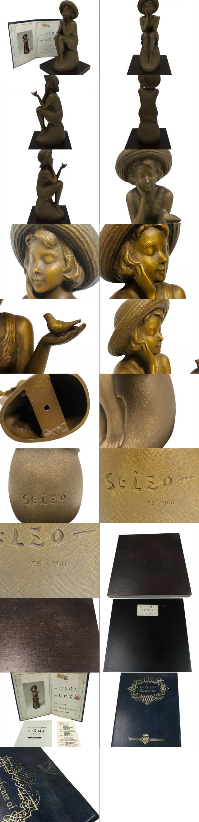 | ※※※必ず最後までお読みになり ご理解の頂けた方のみご入札をお願い致します※※※ 数年前に東京・港区の骨董品店で一目惚れして25万で購入しました。 このたび、家の建て替えでインテリアを一掃するので出品します。 以下、商品の情報になります。 ※サイズは、証明書に記載されている通り、 高さ30㎝、幅10㎝、奥行き14㎝の材質ブロンズ製になります。 ※画像にある証明書付です。 ※状態は、表現・見解の相違が生じる場合がございますので、入札者様自身の経験と 目利きで判断お願いします。その為、画像を沢山掲載しておきます。 一応記載しますと、台座正面右側(画像参照)に小さな塗装剥がれと、すり傷あります。 後、木製台座にすり傷(画像参照)があります。 証明書にも画像の通り汚れがあります。 後、木製台座の底面に以前購入された方が購入金額を貼ってありますが、剥がそうとすると塗装まで剥がれそうなので、剥がしておりません。 ※年代モノですが、状態は当方から見て綺麗だと思います。 尚、送料は当方で負担させて頂きます。 是非、大切にして頂ける方がいらっしゃいましたら よろしくお願い致します! | ||