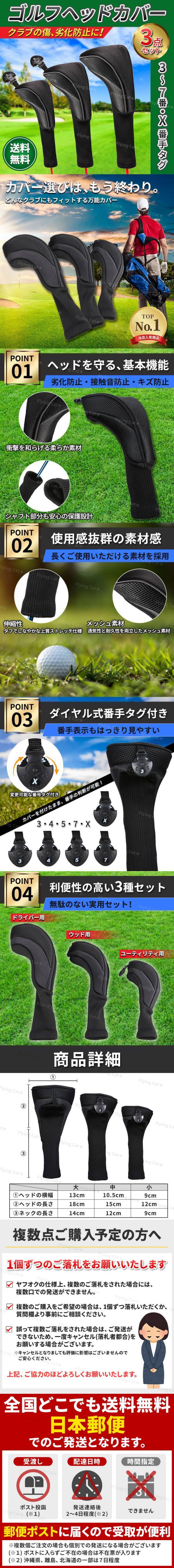 | 【商品サイズ】 大サイズ(ドライバー用):ヘッド横14cm×ヘッド縦17cm、ネック長さ14cm 中サイズ(ウッド用):ヘッド横11cm×ヘッド縦15cm、ネック長さ12cm 小サイズ(ユーティリティ用):ヘッド横8cm×ヘッド縦12cm、ネック長さ8cm 【商品詳細】 セット内容:ゴルフヘッドカバー大中小3点(中小番手タグ) カラー:ブラック 黒 素材:ナイロン生地、メッシュ、ニット ※ご利用のモニター環境により、色合いが異なって見える場合がございます。 |