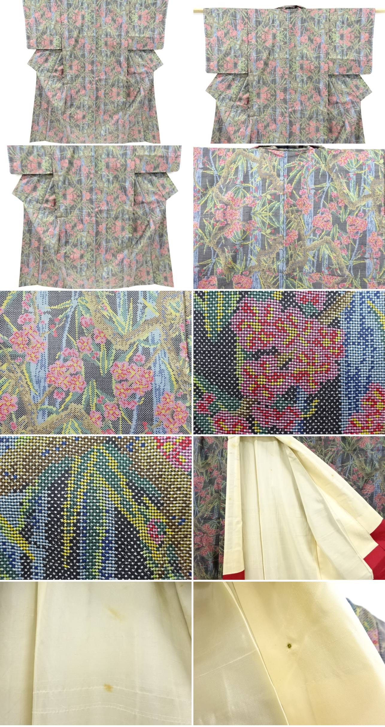 | お着物の状態をできる限りお伝えできるよう努力しておりますが、当店で出品の商品は全てアンティークになります。 一品一品丁寧に検品の上、出品させて頂いておりますが、稀に小さな見落としや、アンティーク特有の経年に伴う汚れや傷のある場合もございますので、アンティーク・中古品にご理解ある方のみのご入札をお願い致します。 寸法に関しましては、一品一品手作業での採寸であり、性質上生地の伸縮性もございますので、若干の誤差はご了承ください。 ごく稀にですが、樟脳やアンティーク特有の匂いがある場合がございます。 匂いに関しては、商品コメントには記載しておりませんので、ご理解の上ご入札下さい。 はぎれ商品につきましては、解き商品が多くなっております。 生地端に縫い糸の残りが多く残った状態での出品となります。 ご理解の上でのご入札と、ご自宅でのお手入れをお願い申し上げます。 | |