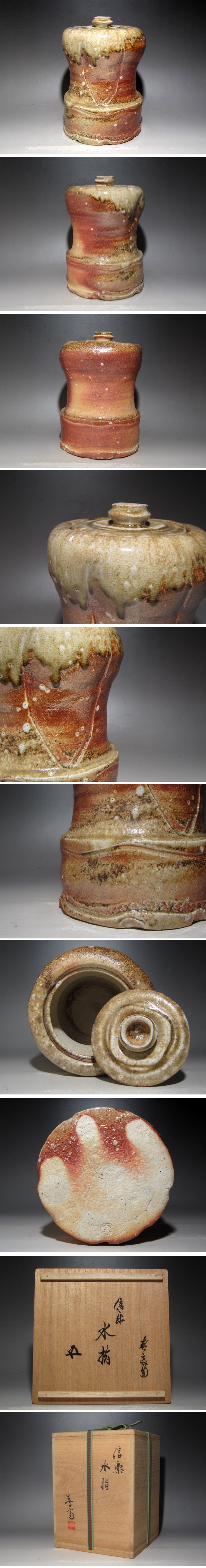 高橋春斎作の信楽水指です。 味わい深い、趣のある作品です。 箱蓋裏に裏千家十五世鵬雲斎の花押があります。 サイズ 直径15cm/高さ21.5cm(多少の誤差はお許しください) 状態 一見して疵やヒビ・直しは見られません。 骨董品という事をご勘案頂き、時代経過のスレや、小さな傷がある場合があるかもしれませんのでご承知置きください。 | |||
