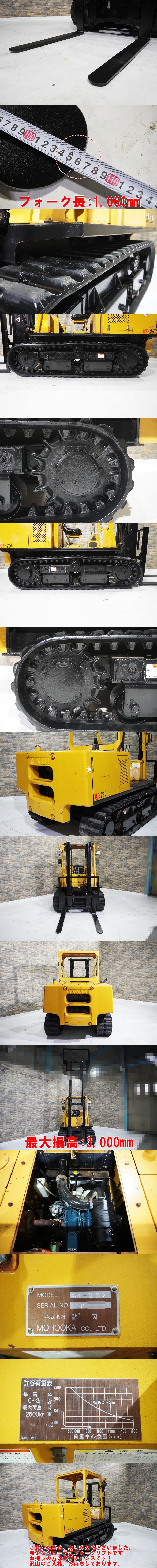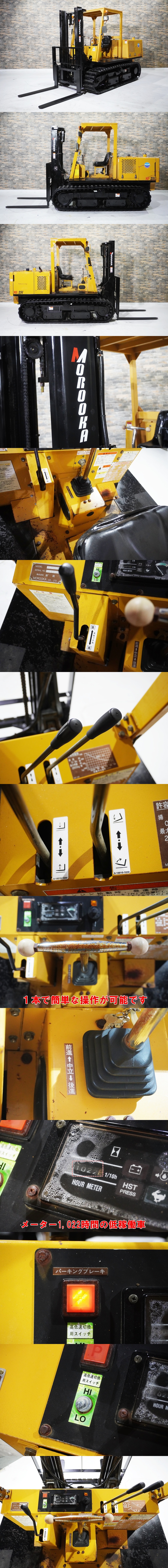 Design by. templu.net オークションをご覧頂き有難うございます。 弊社は、数多くのフォークリフト販売実績を 元に商品の 品質には 絶対の自信 を持って お客様へお届けしております。 是非ご安心してご入札下さい! 皆様に、本物のフォークリフトを 出来るだけお安く提供する為に 目玉商品 【完全売切り】 での 出品となります! 即決価格のご相談・お問い合わせは 株式会社丸総グループ 0569-47-8221まで! 即決価格を設定しておりますが、 弊社へ直接のご交渉も承ります! その為、オークションを早期終了 させていただく可能性もございますので、 ご了承お願いいたします! 今回は、 "超"希少な1台 をご用意しました 諸岡より、 2.5t クローラ式フォークリフト 【MF-25V】 のご紹介です。 ≪担当者コメント≫ でなかなかお目にかかれない 希少な一台が入荷しました。 通常のホイールタイプとは違い 不整地での荷役作業が可能になります。 さらにメーター1,022時間の低稼働。 中古市場でも稀にみる個体です。 探していた方は絶好のチャンスでは ないでしょうか? 希少なクローラ式フォークリフトを お安く手に入れるチャンスです! 沢山のご入札、お待ちしております。 また、安心してご購入いただけるよう動作確認の YouTubeショート動画 を作成しました。 お忙しいお客様に、 1分で動作確認していただけるように 作成しました。 チャンネル登録と高評価お願いします! ショート動画は下記リンクより、ご確認ください。 (yahooの警告が出ますがご安心下さい!!) ↓↓↓↓↓↓↓↓↓ 【MF-25V】 ショート動画 ↑↑↑↑↑↑↑↑↑ ●クローラ式 当然ではありますが、 この機械の一番の強みです。 不整地・軟弱地で大活躍します。 水田、畑地、ぬかるんだ土木現場など 活躍の場は豊富です。 諸岡独自の強靭な足回りが 威力を発揮します! ●希少な低稼働車 メーター1,022時間の低稼働車です。 このモデルで1,000時間台は 中古市場でもかなり希少です。 まさに今がゲットするチャンスです! ●リセール◎ 市場でも高値で取引される 諸岡クローラリフト。 高額な買い物ではありますが、 売る時も値落ちしにくいモデルです。 出口戦略はご安心ください! 【商品詳細】 品名:フォークリフト メーカー:諸岡 型式:MF-25V メーター:1,022時間 燃料:ディーゼル 全長(約):3,880mm 全幅(約):1,590mm 全高(約):2,170mm 機械重量(約):3,970kg 最大揚高:3,000mm フォーク長(約):1,060mm 最大荷重:2,500kg ※機械の下取りも大歓迎! 弊社基準状態ランク:A ------------------------------ トラブルやいたずら入札が多い為、 評価が悪いと弊社が判断した方の ご入札は辞退させて頂きます 何卒ご了承ください。 (注意) 新規の方 のご入札も基本的に 受付いたしておりません。 新規でのご入札を希望の方は 弊社まで一度ご連絡下されば 入札可能 となります。 トラブル防止の為、何卒ご理解下さい。 領収書・請求書を発行希望の方は お取引開始前に必ずご相談ください。 かんたん決済でのお支払の場合は 発行できかねます。 ------------------------------