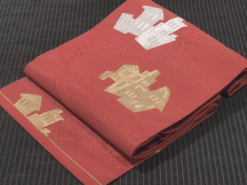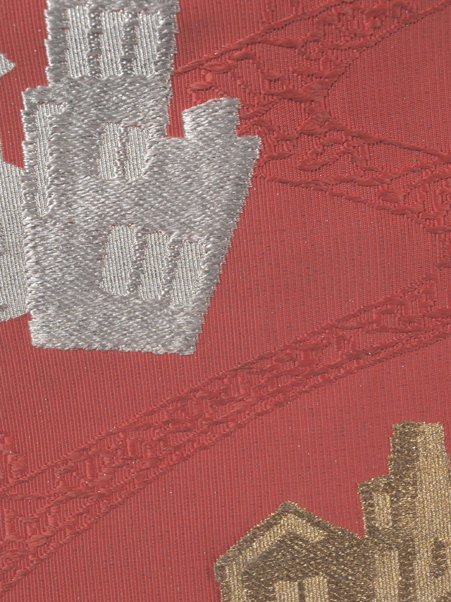 深く沈んだ薔薇(ばら)色の地に、霜降りの地紋が染められ、流水取りでアール・ヌーボー調の唐草と、家とビルなどの街並の文様が織り込まれている、つづれ織の八寸名古屋帯です。 大正~昭和初期ごろにつくられたと思われるアンティークのお品です。ポップなおもしろみとキッチュなかわいらしさが感じられる意匠です。 ユーズド品で、うっすらとした前の折り跡と結びジワがあるほか、たれ上のお太鼓で隠れる部分に直径約 2cm の薄めのよごれが 1 か所、たれ裏に直径約 1-2cm の薄めのスレが 3、4 か所あります。そのほかに目につく大きなしみやよごれ、褪色などのダメージはなく、この時代のものとしてはきれいな状態です。 |