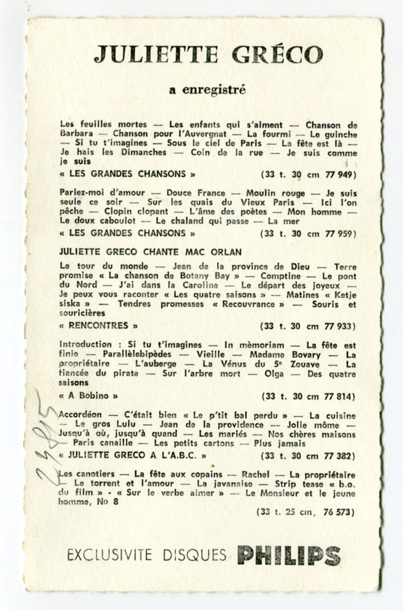 ジュリエット・グレコ JULIETTE GRECO PHILIPS カード 直筆サイン フォト