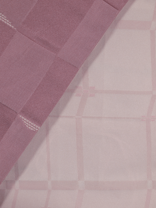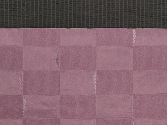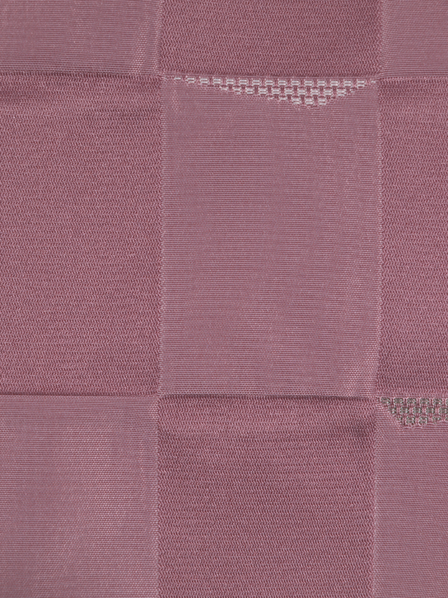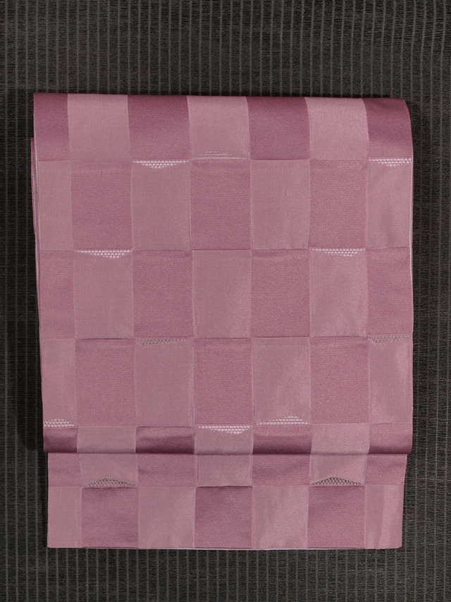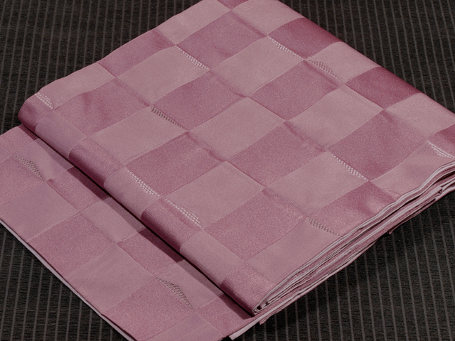 全体的な印象としては沈んだ石竹(せきちく)色といった感じの地に、遠山の配された市松格子縞の文様が織り出されている、洗える着物の綸子の腹合わせ帯です。裏面は沈んだ桜色の地に幾何学的な格子縞の文様が織り込まれています。 小さな遠山が抽象的に配されているので、とてもおもしろみが感じられます。落ち着いたかわいらしさがあり、小粋な雰囲気です。帯芯は入れられていないので、軽めの帯がお好みの方におすすめです。名古屋帯と同様にお使いいただけます。 ユーズド品で、ごくうっすらとした結びジワと前の折り跡がありますが、あまり使用感は感じられません 。目につくしみやよごれ、褪色などのダメージはなく、とてもきれいな状態です。 |