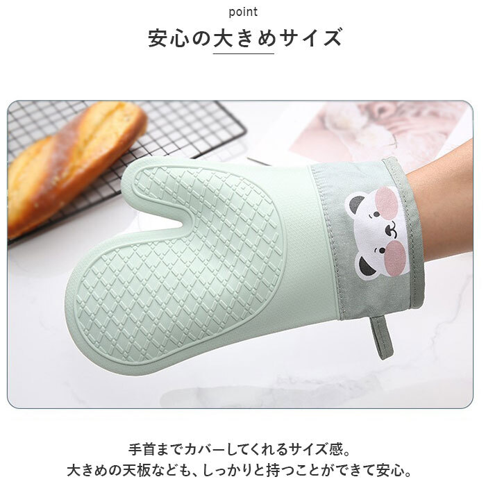 | 商品説明 | ・・毎日のお料理に欠かせないアイテム!可愛らしいミトンが登場。 ・【キッチンに彩りをプラス】 ・柔らかなナチュラルカラーに、可愛いアニマルモチーフをデザイン。お料理のモチベーションもアップ! ・【手のひらをガード】 ・ふんわり程よい厚みのある生地感。熱々のお鍋やお皿を持ち運ぶ際のやけどを防止。 ・【耐熱性があり滑りにくい素材】 ・手のひら(表裏)部分は耐熱性のあるシリコン素材。凹凸仕様で滑りにくいのもポイント。 ・【安心の大きめサイズ】 ・手首までカバーしてくれるサイズ感。大きめの天板なども、しっかりと持つことができて安心。 ・【収納ラクラク!ループ付き】 ・フックなどに掛けておけば、いつでもサッと取り出しOK。 |