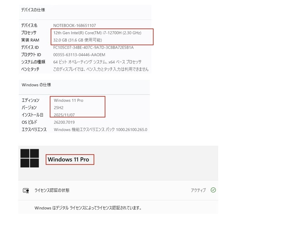 Windows 11 Pro 64bit 新規OS 2025/11/7 インストール |