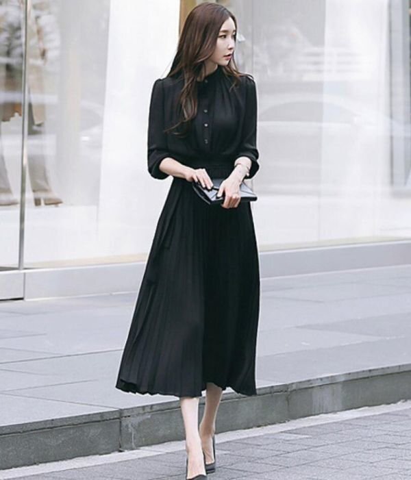 秋新品 人気新作 エレガント 着やせ フォーマル★シフォン 長袖★プリーツロング丈ワンピース ★ 黒 /Lサイズ [浏览原始页面]