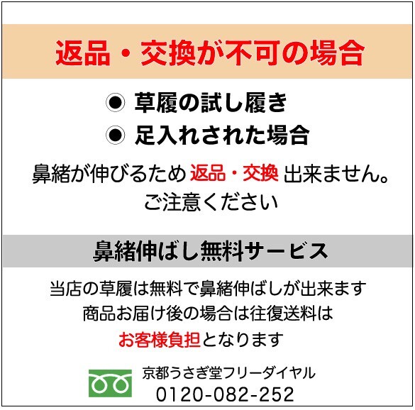 ※鼻緒伸ばしをされた草履の返品交換も出来かねますので予めご了承ください。