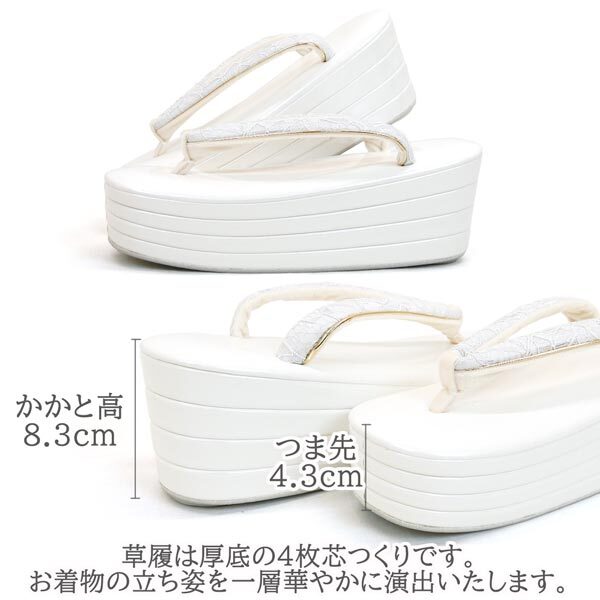 草履は厚底の四枚芯作りで、お着物の立ち姿を一層華やかに演出いたします。