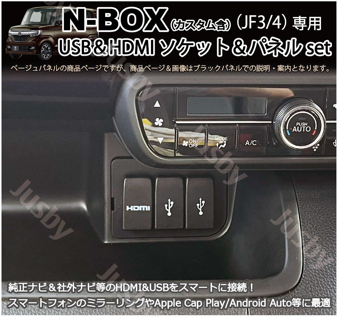 | N-BOX(JF3/4) 専用 USB/HDMIアダプタ&【ベージュ】パネル&ケーブルセットです。 2017.9発売のホンダN-BOX & N-BOXカスタム JF3/JF4 (前期&後期対応) 専用 USB&HDMIアダプタ&【ベージュ】パネル&ケーブルセットです。 当商品は【ベージュ】パネルです。ブラックカラーは別途出品しています。落札後のカラー変更は出来ませんのでご注意ください! パネルやアダプタ含め全て当社オリジナル商品となります。純正ルックにHDMIポートを追加できるだけで なく今まで充電専用だったUSB×2部分がナビ と接続可能なUSBに変更できます。 今まで助手席前グローブBOX等にいれていた、 HDMIやUSBケーブルがスマートにアクセスできる様になります。 ナビとスマホの接続により充電は勿論 メモリースティック等を使用すれば 音楽・動画再生等スマートにアクセスが可能 になります。(ナビの仕様に準じます) またナビとHDMIを接続することにより HDMIの映像入力が可能になります スマートフォン画面をナビで映す事やFire TVstick が使用可能になりナビの可能性が広がります USBケーブルは約60cm HDMIケーブルは1mの長さとなっております。 USB端子は2Aの給電に対応可能なUSB2.0に準拠する高品質ケーブルを採用しております。 またHDMI端子は金メッキ処理により耐腐食性・通電安定性の高い仕様です。 製品コネクタ仕様 「USB Aタイプ雌ーAタイプ雄」 / 「HDMI Aタイプ雌ーAタイプ雄」 社外ナビ取り付け時に同時に接続・設置すると手間も省けてお薦めです。是非ナビ取付キットと一緒にどうそ! 注意事項 ・パネルカラー車両パネルのブラックとベージュの設定があります。(一部車両に黒茶タイプもありますが設定はございません) ・社外ナビや純正ナビはUSB接続に別途、ナビメーカー製のオプションケーブルが必要になる場合があります。 ・HDMI入力もしくはAV入力可能なナビが装着されている事が前提の商品です。ナビ仕様をご確認の上お買い求めください。 ・配線方法については画像説明のQRコードもしくはURL(https://jusby.co.jp/data/nbox_flowchart.pdf)をご確認ください。 別売りケーブルのご案内(変換ケーブル等が必要な場合は合わせてご用意ください) HDMI E-A変換ケーブル (純正ナビや一部社外ナビ等のナビ側のHDMIコネクタがEタイプの場合に使用します) HDMI D-A変換ケーブル (CarrozzeriaやKENWOOD等ナビ側のHDMIコネクタがDタイプとなっている場合に使用します) 標準でUSBケーブルが付属のナビと付属しないナビがあります。 付属しない場合は別途、専用の接続ケーブルが必要です。 (一部ナビの互換ケーブルは当社で販売しております。 純正ケーブルより安価で純正より長い保証付き) イクリプスナビ用 USB111 ・ パナソニックナビ用 CA-LUB200D ・ カロッツェリア用 CD-U120 ( ・∀・)Φスタッフレビュー 純正ルックで非常にスマートにインストールされる為、後付感ゼロです。 社外ナビとの接続ケーブルは通常、グローブボックス等に無造作に繋げられがちですが、当商品を使うことにより 非常にスマートにインストール可能です。 是非社外ナビ取り付けの際は一緒にお買い求め下さい。 |