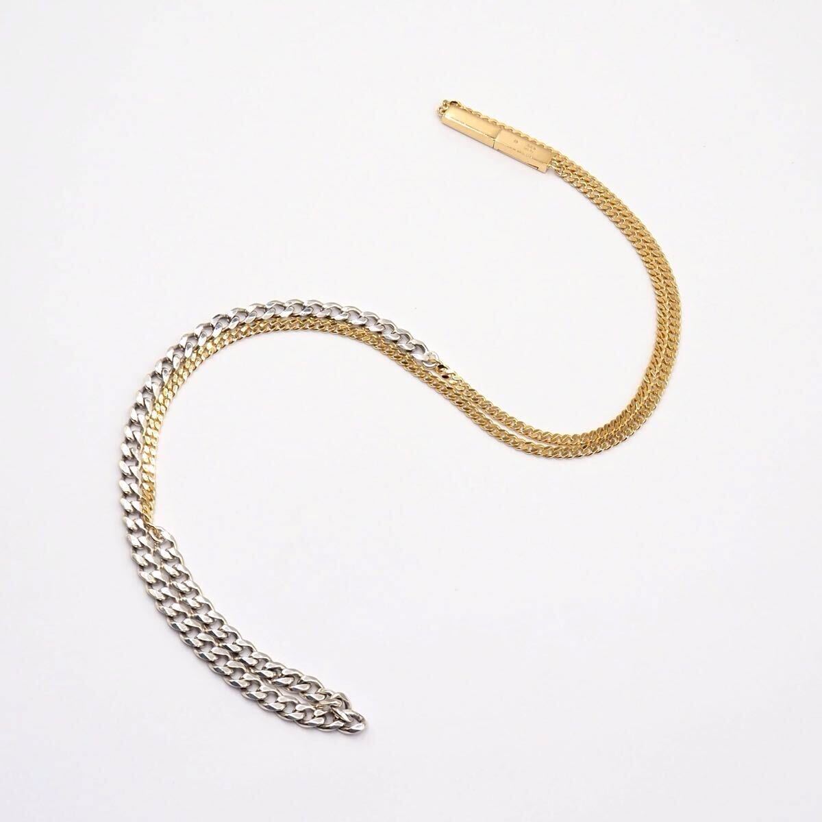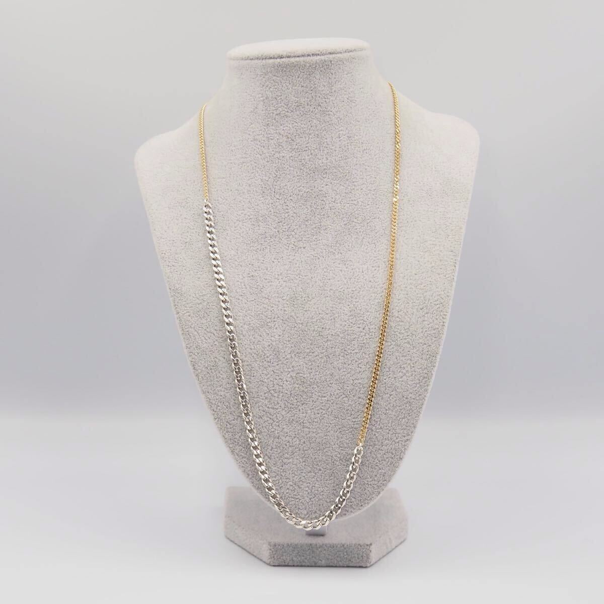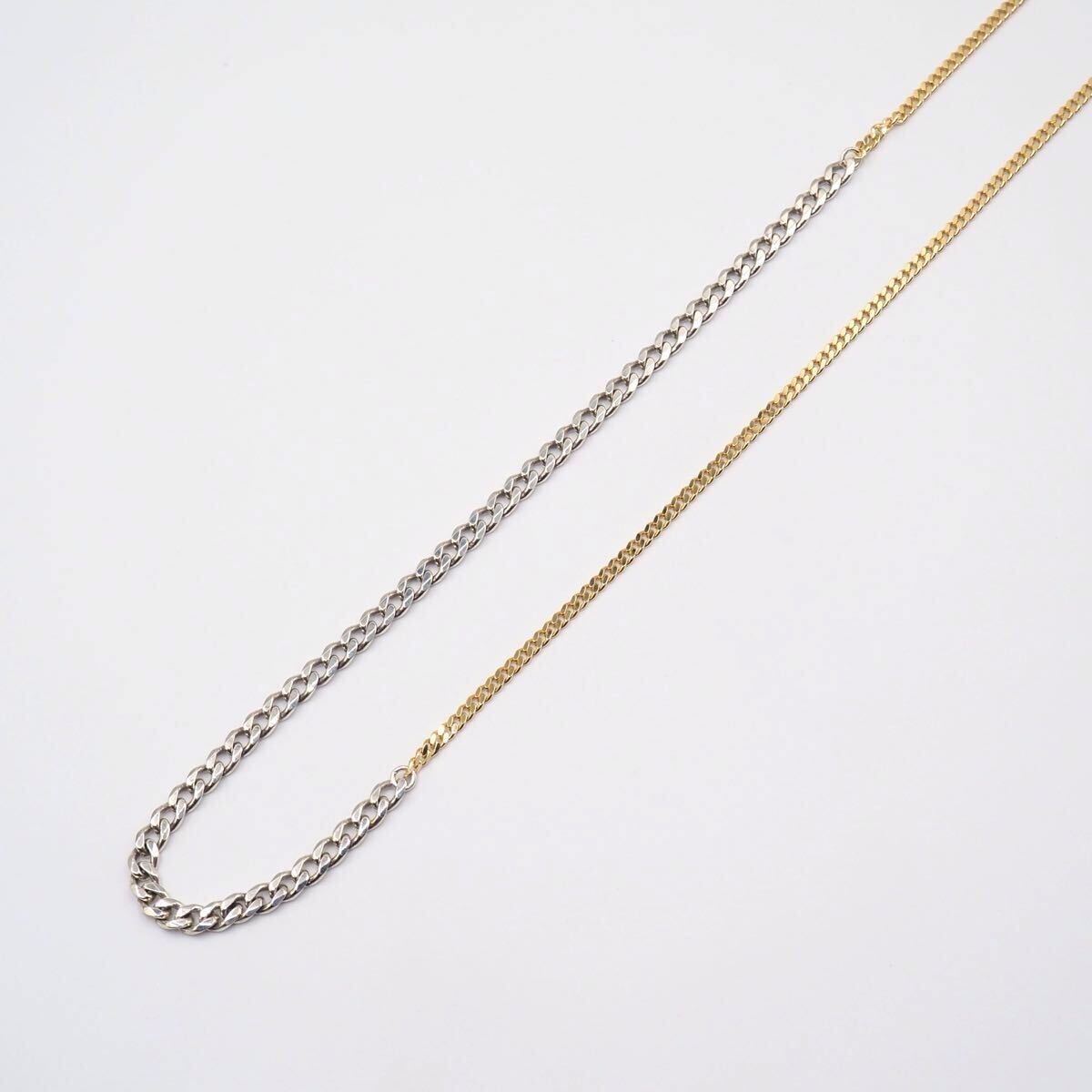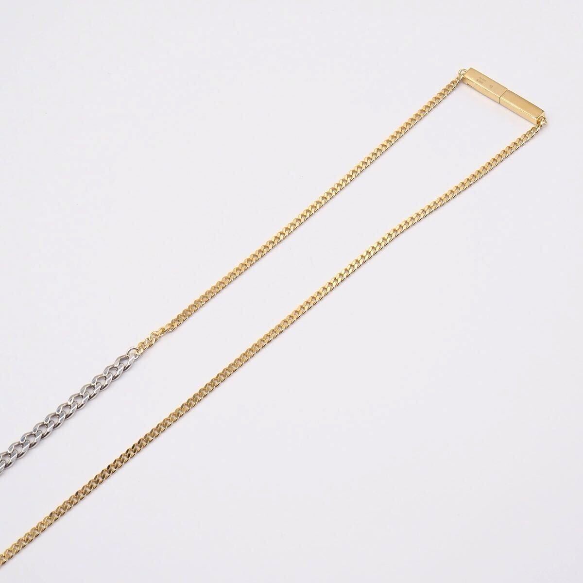 太さも色も違うシルバーとゴールドのチェーンが繋がれたひとつつけるだけでたくさん楽しめるネックレスです。チェーンが長めなので重ね付けにも最適です。
