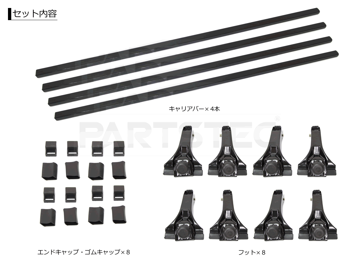 | セット内容 | ・キャリアバー ×4 ・フット ×8 ・エンドキャップ ×8 ・ゴムカバー ×8 ・説明書 ×1 ※部品のみの販売は行っておりません。予めご了承ください。 |