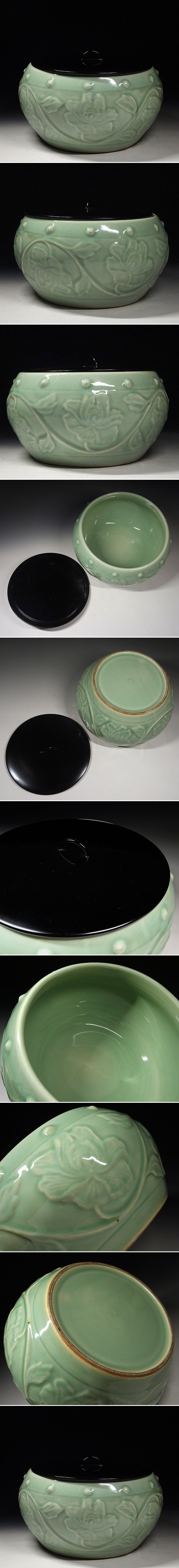 緑屋h■時代物 青磁 水指 陽刻 鼓型 塗り蓋 茶道具  i9/11-6164/26-2#100 [浏览原始页面]