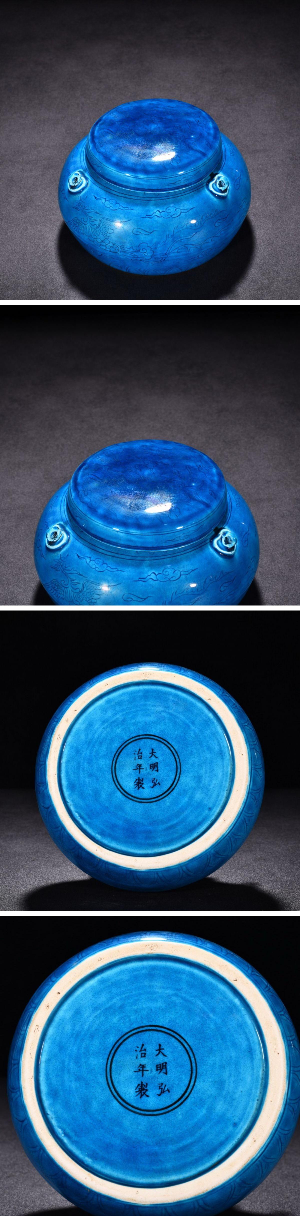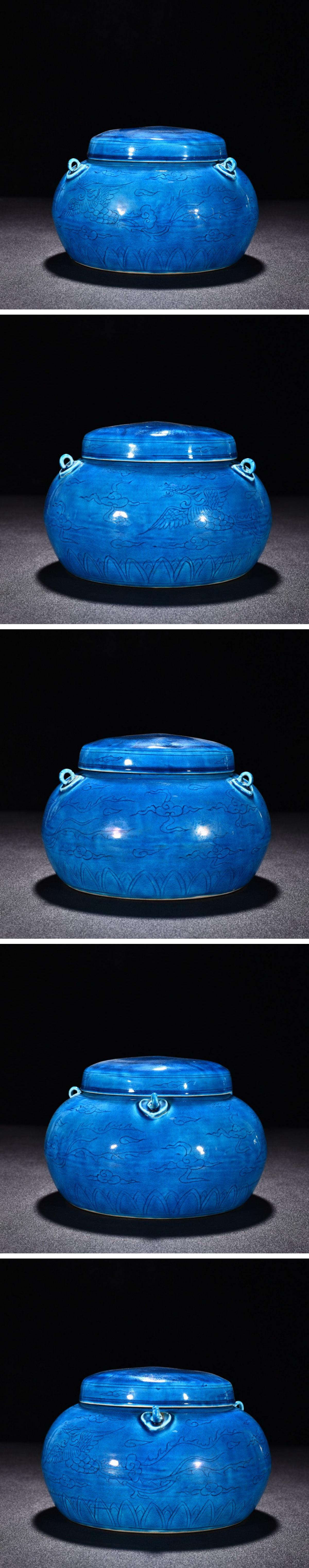 【雲錦】1円から 明時代 大明弘治年製 孔雀藍釉刻鳳文缶 茶煎道具 時代物保証 古美術 骨董品8L21-5HP