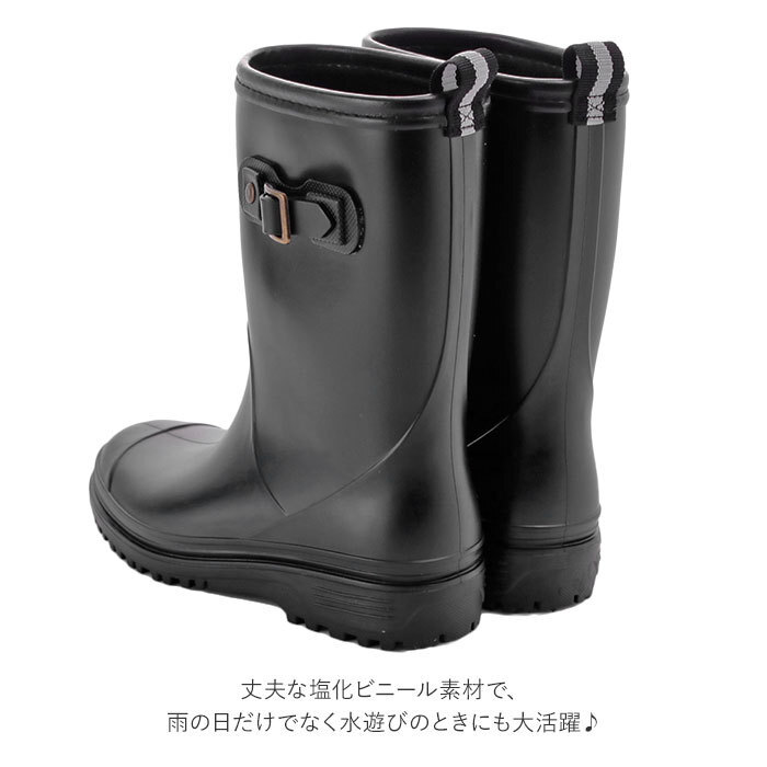 | 商品説明 | ・ミドル丈のキッズ用レインブーツ。 ・マットな風合いのジョッキータイプデザインで、性別関わらずスタイリッシュに着こなせる! ・サイドに施された、アンティーク風ゴールドのメタルパーツがかっこいい♪ ・丈夫な塩化ビニール素材で、雨の日だけでなく水遊びのときにも大活躍♪ ・アウトソールには、深い溝のスリップ加工を施しており、滑りやすい雨や雪の日も安心。 ・ブーツの中が濡れてしまっても、取り外し可能なインソールなのでお手入れが簡単。 ・履き口にタブがついているので、お子様でも脱ぎ履きしやすい! |