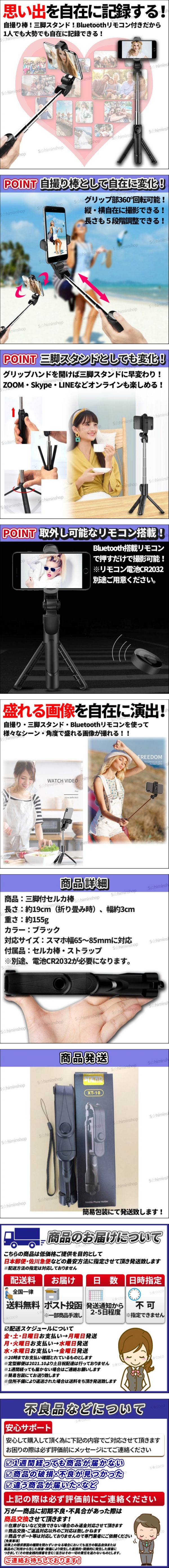 | 【商品】 ★Bluetooth対応セルカ棒 【長さ】 ★約19cm(折り畳み時) ※使用時最小・約長さ28cm ※三脚時最小・約長さ25cm/最大長さ約65.5cm ★幅:約3cm 【カラー】 ★ブラック 【付属品】 ★自撮り棒(リモコン付き)・ストラップ ※別途ボタン電池CR2032が必要となります 【使用方法】 ①リモコンボタンを5秒長押しします ②ライトが青色に点滅したらペアリングモードになります ③スマホ側でBluetooth・ONにして、XIONG TUを選択します ※リモコンライトが点滅が消えると接続成功になります | |||