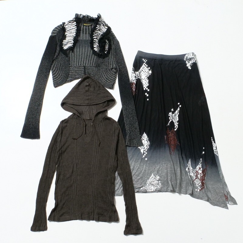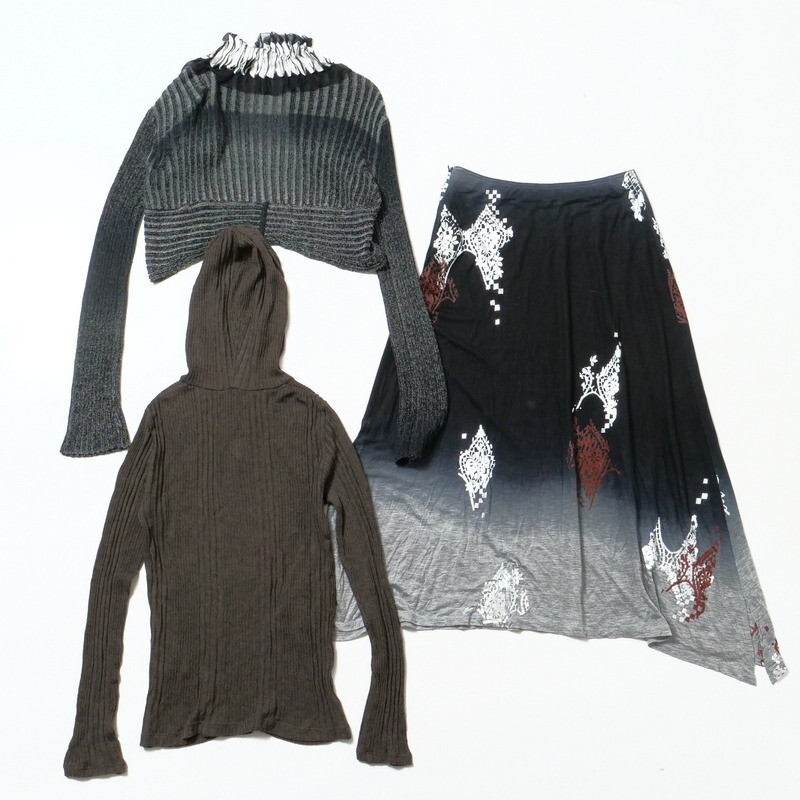 | MI2615★3点セット HIROKO KOSHINO ヒロココシノ シルク装飾/クロップド セーター/リブニットパーカー/膝下丈スカート 黒/茶 42/38/11 | |||