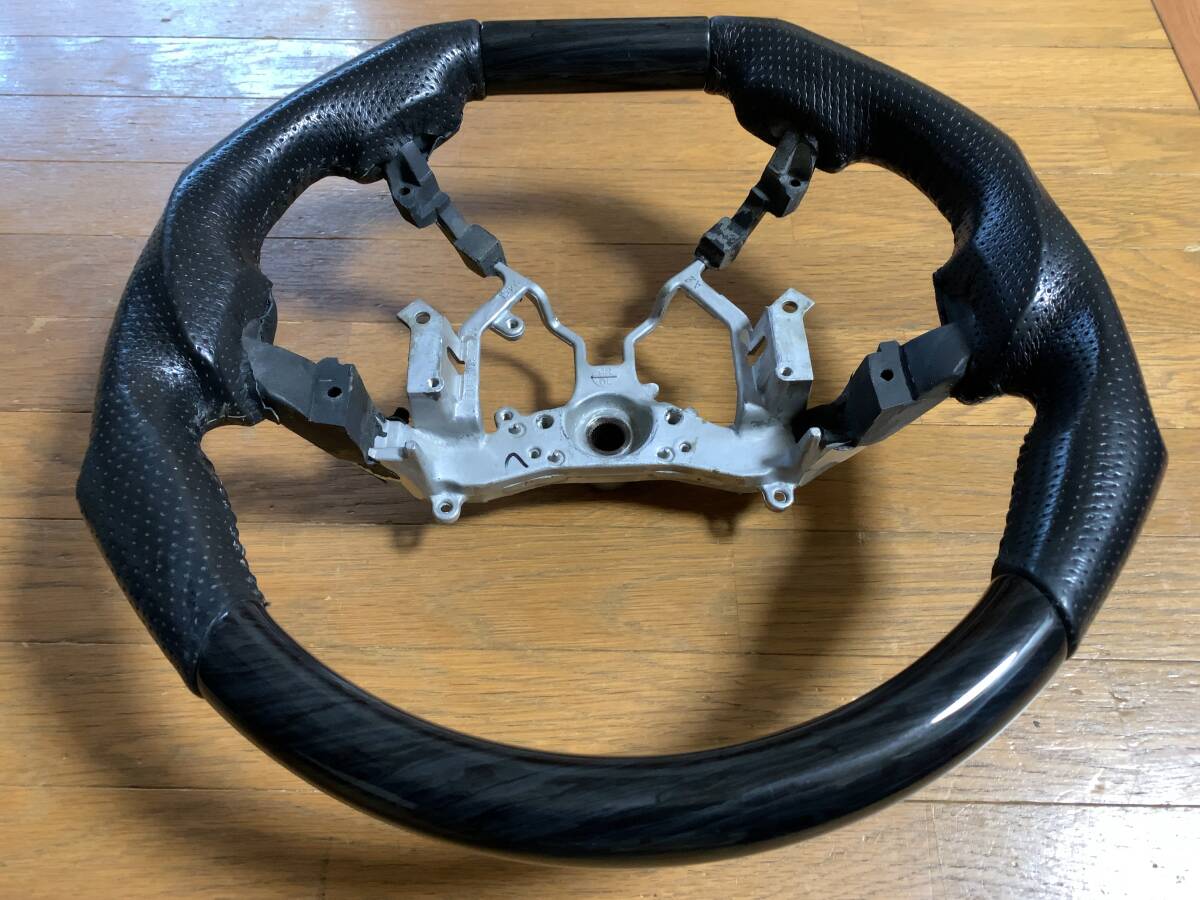 200系ハイエースから取り外した黒木目 × 本革 ブラックパンチングレザー コンビ ステアリングです。メーカーはわかりませんが、仕上り感・革の質感共に高級感がありますので、大手のメーカー物ではないかと思います。状態は中古となりますので、使用に伴うキズや汚れはありますが、綺麗にエイジングされており、状態の良い中古ステアリングです。上質なレザーが使用されているので、安物に見られがちな表皮の剥がれもなく、末永くお使いいただける逸品です!チープな内装が一気にゴージャスに変身します。写真の通り綺麗な商品ではありますが、本品中古につき使用に伴うキズ・汚れが御座いますので、神経質な方はよくご確認の上ご購入ください。お探しの方いかがでしょうか?他にも多数出品していますので、宜しければご覧下さい。
