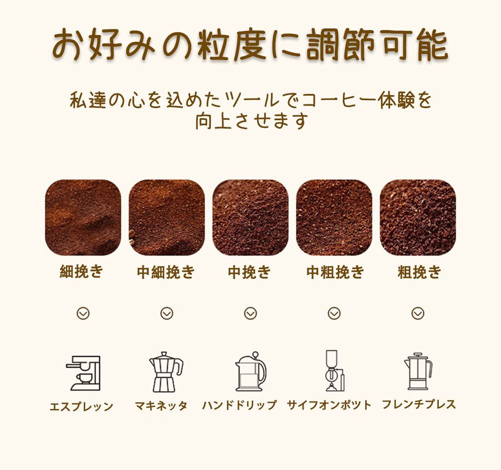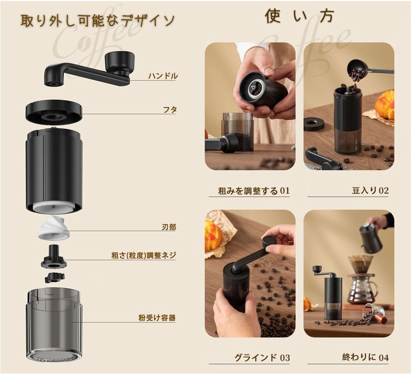 商品説明| 商品名 | おしゃれな手挽きコーヒーミル 手挽きコーヒーミルは、手動ハンドルを備え、段階的な粗さ調整が可能なため、好みの挽き目を実現できます。 軽量で持ち運びが簡単なため、出張や登山、アウトドアでの使用に最適です。 省力性に優れ、お手入れも簡単で、水洗いが可能です。 おしゃれなデザインが特徴で、コーヒー豆を手軽に挽くことができ、コーヒータイムをより豊かにします。 |