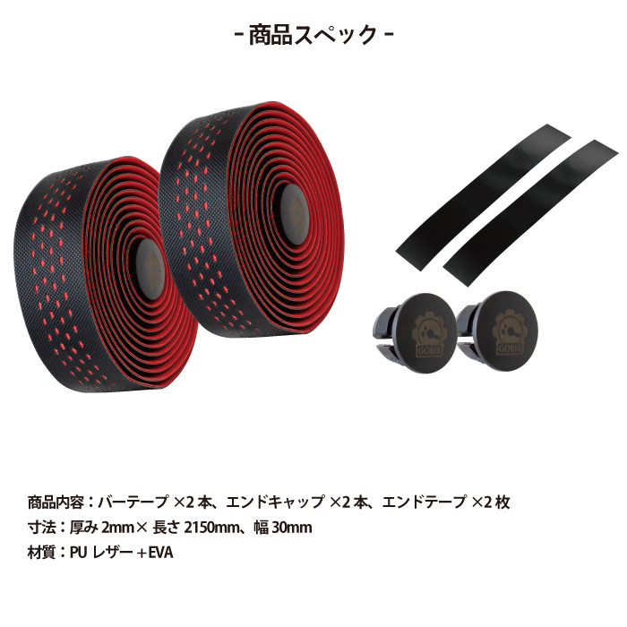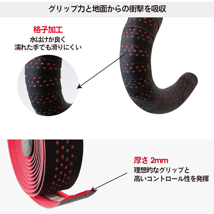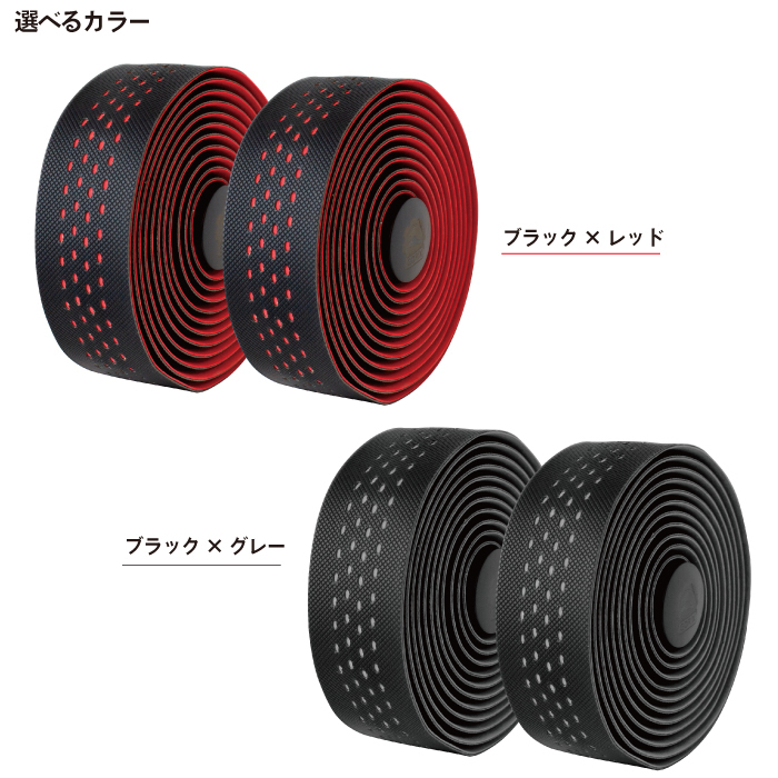 | ロードバイクなどのドロップハンドルに最適な自転車用バーテープ 少し厚めで表面はしっかりとしたグリップ面のバーテープです。 ブラックベースでカラーがちらりとみえるがマストです。 ・振動吸収性に優れたEVAとエコレザーの2層構造のバーテープ。 ・握り心地が良い、触り心地はモチモチ ・表面滑り止め加工効果良好、重ねたジェル層の振動吸収性能を向上 ・厚さは 2mm で、理想的なグリップと高いコントロール性を発揮 ・綺麗な二色カラー。 ・軽量・環境にやさしい素材 寸法:直径φ6.8mmx 長さ16mm/0.6インチ 商品内容:バーテープ×2本、エンドキャップ×2本、エンドテープ×2枚 寸法:厚み2mm×長さ2150mm、幅30mm 材質:PUレザー+ EVA | |
