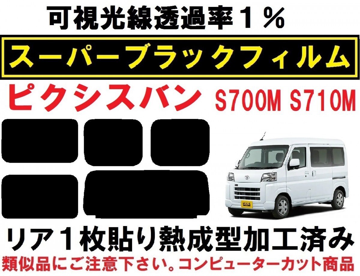 S700M S710M ピクシスバン 用スーパーブラック『可視光線透過率1%』1枚貼り成型加工済みフィルム リア5面セットです。(専用施工液付き) 令和3年12月~ S700M S710M に適合します。 ●画像2 メーカーオプション、ポップアップ機能付きガラス(スライドドア部分)にもご対応出来ます。 ●画像3 メーカーオプションのスマートインナーミラー、カメラ部分の切り抜きにもご対応出来ます。 ※どちらも、ご指定の無い場合は標準カットとなります。 ※適合等ご不明な事など御座いましたら、お気軽にご質問下さい。 ◇◆◇プロ仕様のヘラセット付き商品も出品中です◇◆◇ こちら ◇◆◇精密コンピューターカット◇◆◇ 貼りやすさを最優先に各部のサイズ・形状など微調整し、改良を重ねた独自のデータを製作。 高精度な最新・大型カッティングプロッターによるカットで正確で滑らかなカットラインを再現しています。 施工業者だからわかる、貼りやすいサイズ・形状に仕上げています。 ◇◆◇リア1枚貼り成型加工済み◇◆◇ リアガラスの湾曲に合わせて熱成型加工して有りますので、平面に貼るのと同様にたるみが出ず1枚貼り出来ます。 ※最適な状態に成型加工して有りますので、ヒートガン(ドライヤー)等は不要です。 ◇◆◇専用施工液付属◇◆◇ 軽視されがちな施工液ですが、貼りやすさに大きく関わる部分になります。中性洗剤などで代用せず、必ず付属の専用施工液をご使用下さい。 濃度については車種・季節などにより変わりますので、個別にお知らせ致します。 ◇◆◇業務用高品質フィルム使用◇◆◇ 使用しているフィルムは、安心の国内メーカー 業務用高品質フィルム「ニュープロテクション」シリーズです。(可視光線透過率1%) 業務用フィルムの中で最も濃いタイプで、紫外線99%カット 遮熱性も高めです。 同シリーズで可視光線透過率 5% 10% 15% 25% の物もご用意出来ます。 ご希望の場合は、ご落札後濃さの指定をして下さい。(部分的な色変えも可能です) ご指定の無い場合、全て1%になります。 部分的にフィルムが必要になった場合、単品販売も承ります。 他にもピクシスバン用フィルム、各種出品中です。こちらもご覧ください。 ご不明な点など有りましたら、お気軽にご質問下さい。 | ||