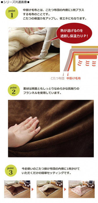 | 両面にソフトな肌感触のフランネル生地を使用しています。掛け布団と中掛け毛布の二重構造で使用して頂ければ熱が逃げにくく、保温性アップ! |