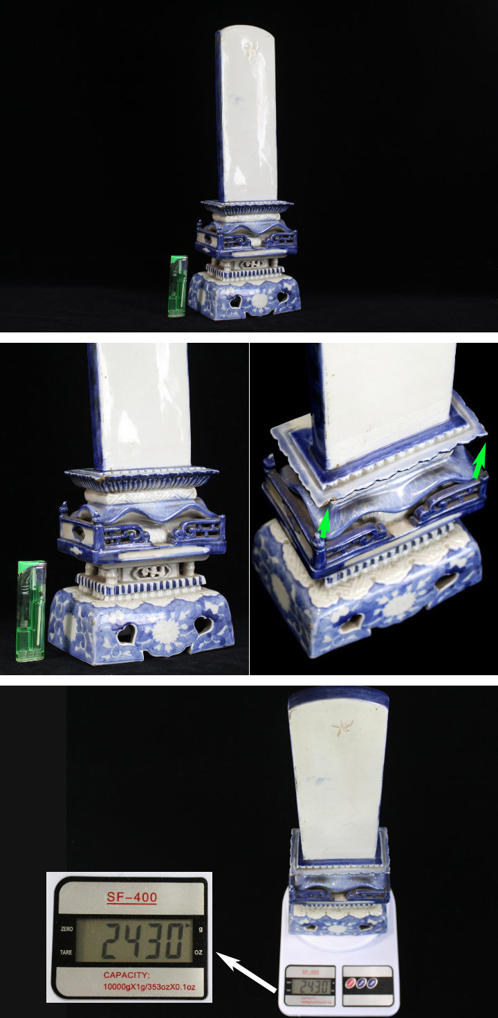 サイズ:39.0cm 染付の大きな牌に見えます。 用途が分からず知人に聞きました。 「三界萬霊」の文字を書いて貼るのだと・・・ 教えて頂きました。 正確な事は分かりません。 どなたかお教え願えたら幸いです。 目立ちませんが古い小さな傷みがあります。 写真をご覧の上ご入札宜しくお願い致します。 三界萬霊(さんがいばんれい) 三界とは「欲界(よっかい)」「色界(しきかい)」「無色界(むしきかい)」を表し、私たちが生死の生まれ変わりから脱することの出来ない“迷いの世界”を表しているそうです。 欲 界 … 淫欲、食欲、睡眠欲の強い衆生が住む世界 色 界 … 諸欲を離れた衆生が住む世界 無色界 … 一切の欲から離れ、心清らかな衆生が住む世界 上記.三つの世界に住する全ての精霊を「萬霊」と称します。 | |