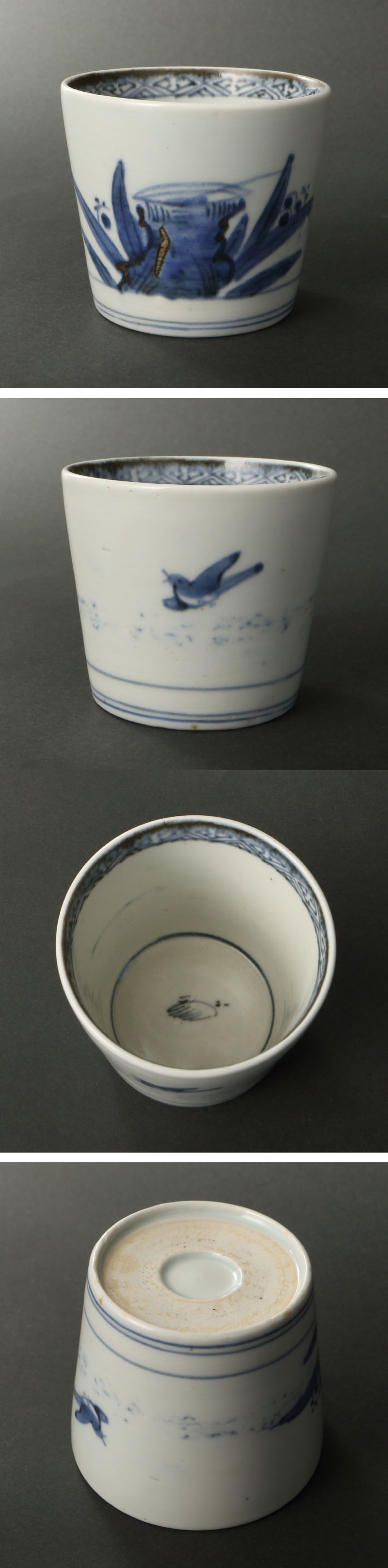 化政様式の蕎麦猪口です。 飛ぶ時鳥に手水鉢と柄杓を染付しております。 このままでも初夏の涼やかな風景を描いたものと取ることができますが、往々にして蕎麦猪口は謡曲のゆかりや役者の文様などを採用することも多く、本作もその一つと見られます。 年代の近い文政8(1825)年初演、四世鶴屋南北作『初冠曽我皐月富士根』(げんぷくそが さつきのふじがね)では、曽我兄弟の夜討の場面で、虎御前が手水鉢で手を洗う際、「名乗りかけたる冥土の鳥、啼く音血を吐く」時鳥の声に思わず涙する姿が描かれており、虎御前の悲しみを暗示した留守文様とみられます。 ただ、遡る文化5(1808)年初版、柳亭種彦作『浅間嶽面影草紙』には、浄瑠璃『けいせい浅間嶽』の翻案にて、浅間巴之丞の正室瞿麦(なでしこ)と侍女が、側室時鳥(ほととぎす)に手水鉢の柄杓を持たせ責め苛む場面、そして後編の『逢州執着譚』では毒殺された時鳥の怨霊が手水鉢から陰火(人魂)となり現われ、「不如帰々々々」と啼きながら飛び回り、果てには瞿麦を狂死させる様が描かれており、「時鳥と手水鉢」のモチーフの淵源の奥深さが感じられます。 『石切梶原』では手水鉢が梶原景時により一刀両断され、『傾城反魂香』では死を決意した浮世又平が手水鉢に自画像を描くと石の裏まで絵が突き抜けるなど、歌舞伎における手水鉢はさまざまな奇瑞の象徴として舞台に現われます。一説には殺生石の伝説がモチーフになっているといわれますが、『初冠曽我』の手水鉢はいわゆる「虎が石」、浮世と冥土のあわいに、虎御前の一念が凝り固まった象徴なのやもしれません。奇しくも見込みの文様は「岩波」と称される石の文様です。 蕎麦の名産地・信州には善光寺近辺に虎御前が隠棲したという伝承もあり、遊行の宗教者が語った「奇瑞」が浄瑠璃や歌舞伎に変貌したように、蕎麦猪口の文様が単なる「江戸の粋」ではなく、生死を彷徨うような厳しい木食修行や飢饉のたびに命をつなぐ神聖な料理の象徴であったのだとつくづく考えさせられます。見事な逸品です。 寸法:高さ7cm、幅8cm(最大幅。若干の誤差はご了承下さい) 状態:経年感、使用感、複数カマキズがございます。 |